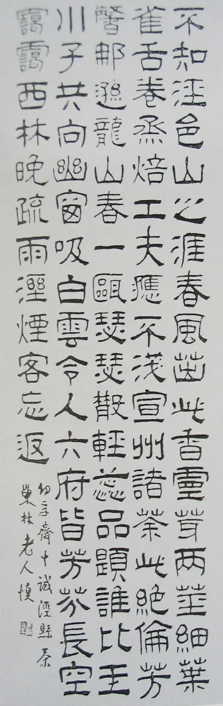 汪巢林的隶书以汉碑为宗,《幼孚斋中试泾县茶》条幅,可谓是其隶书中的一件精品。值得一提的是,条幅上所押白文“左盲生”一印,说明此书作于他左眼失明以后。这首七言长诗,通篇气韵生动,笔致动静相宜,方圆合度,结构精到,茂密而不失空灵,整饬而暗相呼应。该诗是汪士慎在管希宁(号幼孚)的斋室中品试泾县茶时所作。
