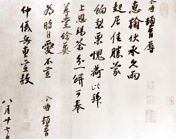 宋皇佑二年(1050年)11月,蔡襄自福建仙游出发,应朝廷之召,赴任右正言、同修起居注之职。途经杭州,约逗留两个月后,于1051年初夏,继续北上汴京。临行之际,他给邂逅钱塘的好友冯京(当世)留了一封手札,这就是《思咏帖》。信札全文如下: