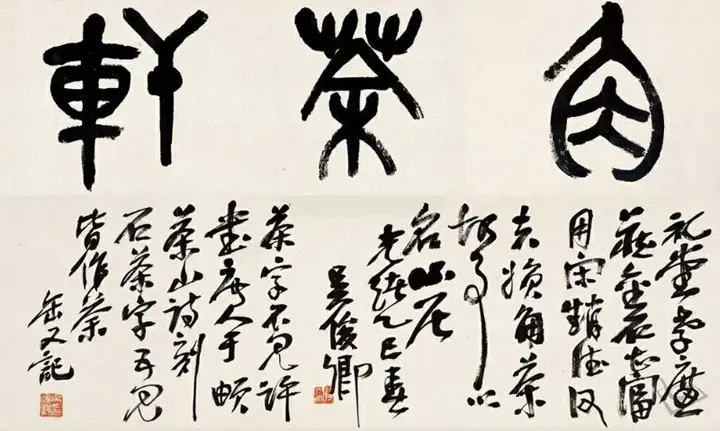 “角茶轩”,篆书横披,1905年书,大概是应友人之请所书的。这三字,是典型的吴氏风格,其笔法、气势源自于石鼓文。其落款很长,以行草书之,其中对“角茶”的典故、“茶”字的字形作了记述:“礼堂孝谦藏金石甚富,用宋赵德父夫妇角茶趣事以名山居。…茶字不见许书,唐人于茶山诗刻石,茶字五见皆作荼…”