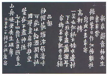 与《茶经》同列于茶书目录的尚有《煎茶七类》。行书《煎茶七类》刻帖的原石,现藏浙江上虞文化馆。《煎茶七类》带有较明显的米芾笔意,笔画挺劲而腴润,布局潇洒而不失严谨,与他的另外一些作品相对照此书多存雅致之气。