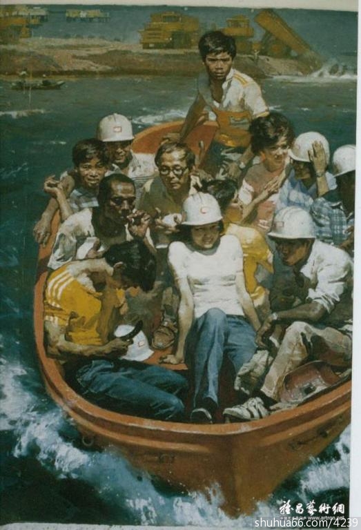 《白藤湖上》,随画院分队赴斗门白藤湖,印象最深的是在湖中划船的儿童,触起了我对童年乡间生活的回忆。时正值夏收,社员都到了田间劳动,放暑假的小学生帮忙运榖,湖光潋滟,水中荡舟,一片诗情画意,试用国画构图画油画,仅作尝试。