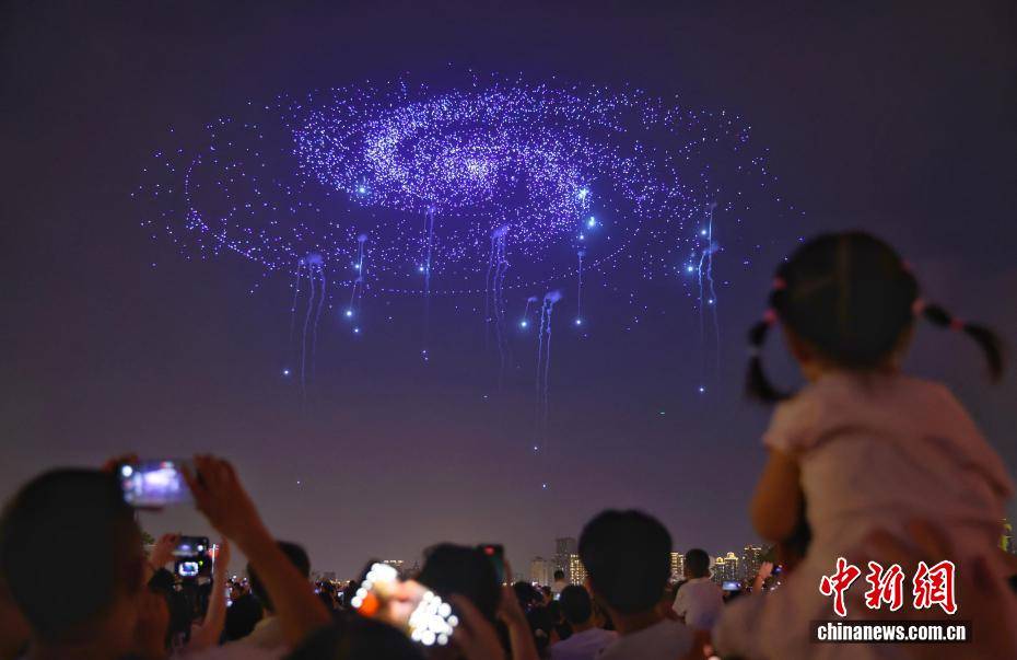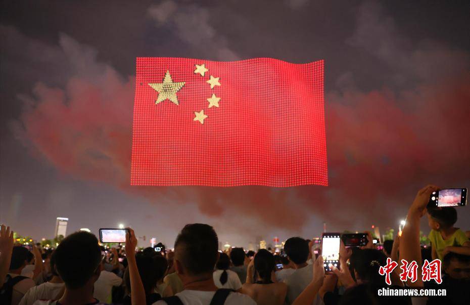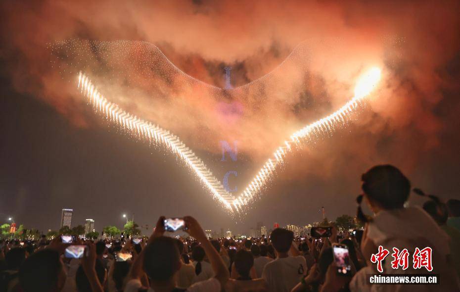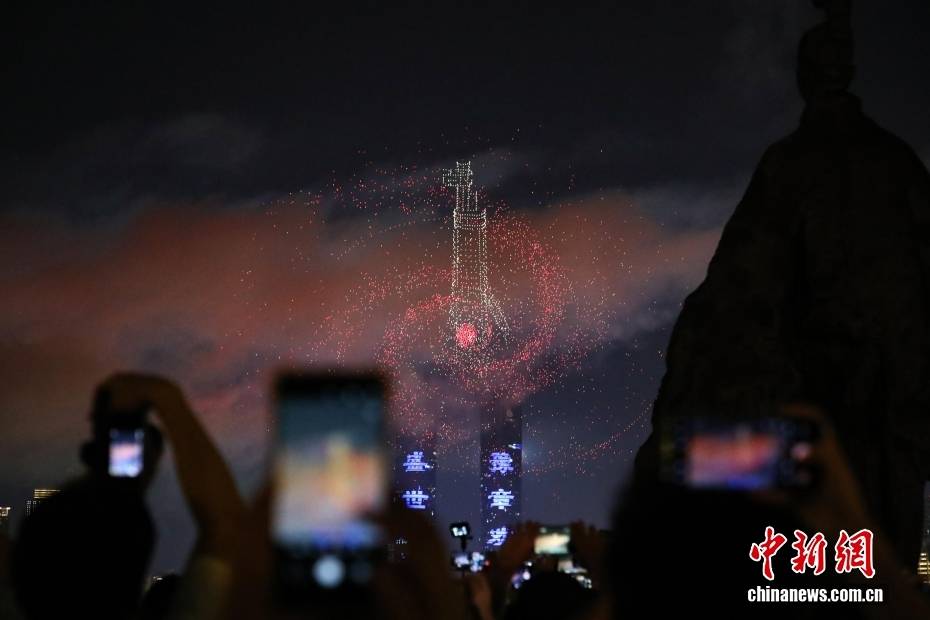 10月1日晚,以“盛世华彩 豫章欢歌”为主题的2025年南昌市国庆烟花晚会在赣江中心区域的老官洲水域举行,为市民游客打造一场兼具艺术性与科技感的沉浸式视听盛宴。图为民众正在拍摄无人机编队表演。中新社记者 刘思伟 摄