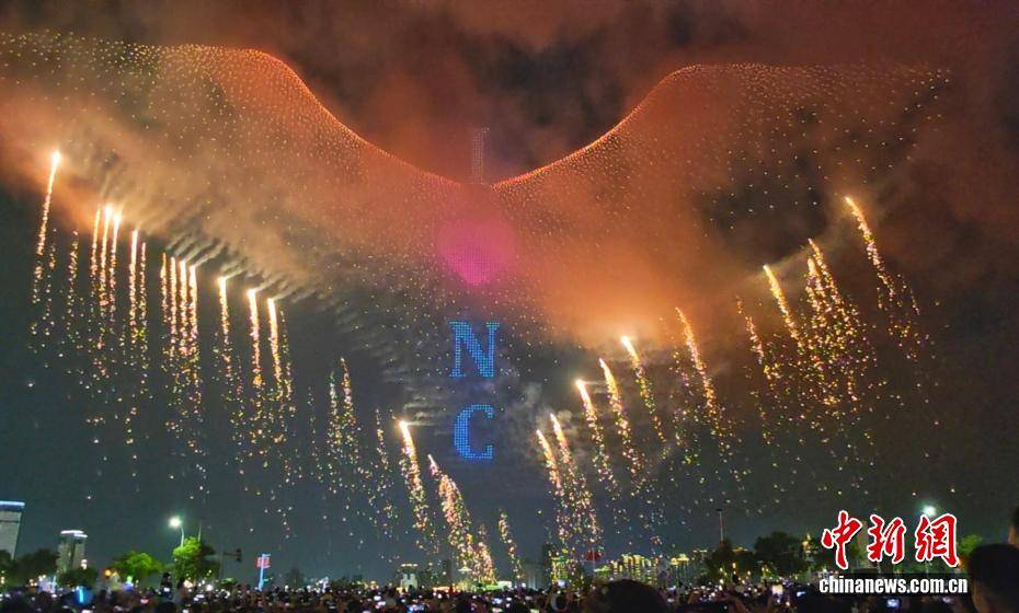 10月1日晚,以“盛世华彩 豫章欢歌”为主题的2025年南昌市国庆烟花晚会在赣江中心的老官洲水域举行。现场,5000架无人机编队在空中进行“夜幕叙事”,从闪耀五星到梦想之翼,从千里江山图到银河星雨,为市民游客打造一场兼具艺术性与科技感的沉浸式视听盛宴。图为5000架无人机和焰火组成的“梦想之翼”画面。中新社记者 刘占昆 摄