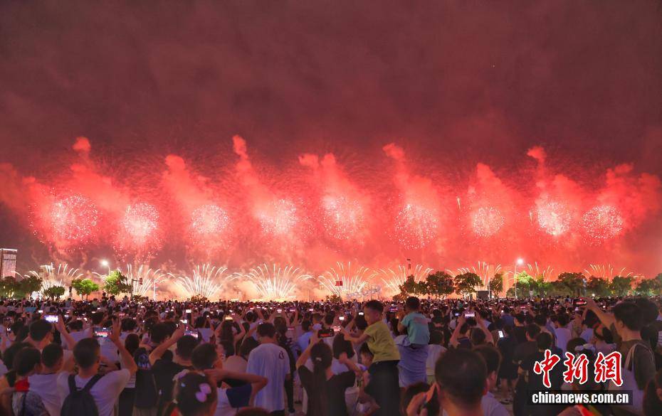 10月1日晚,以“盛世华彩 豫章欢歌”为主题的2025年南昌市国庆烟花晚会在赣江中心区域的老官洲水域举行,为市民游客打造一场兼具艺术性与科技感的沉浸式视听盛宴。图为璀璨烟花在赣江之畔的王勃广场上空绽放。中新社记者 刘思伟 摄