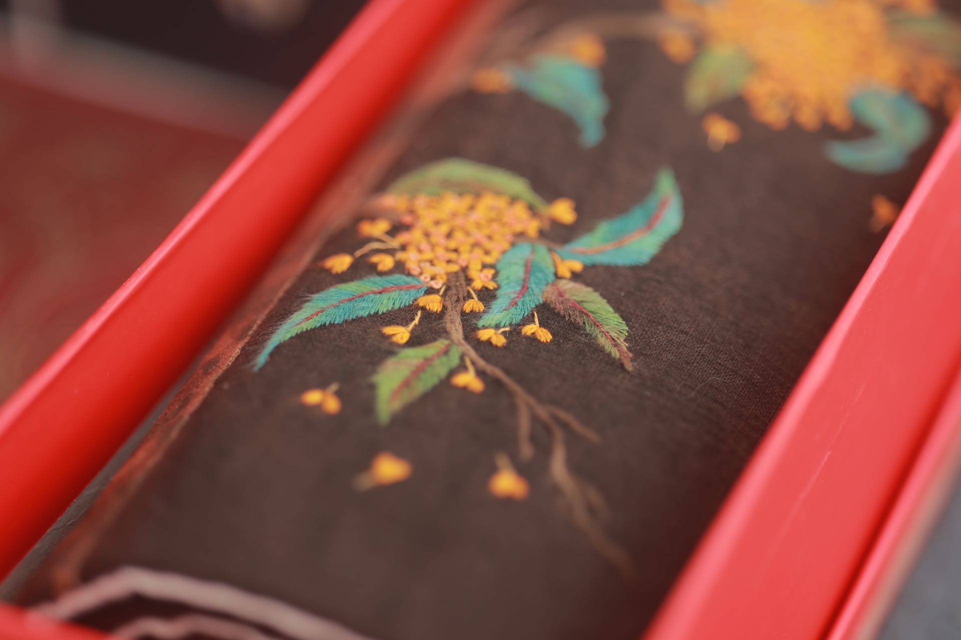 一一数字纹样,唤醒沉睡的桂花美学。博物馆将馆藏的桂花纹样进行数字化呈现,设计并推出了一系列以桂花为灵感的文化产品,包括桂花茶席、桂花团扇、桂花苏绣项链以及桂花书签等。这些作品不仅展示了丝绸艺术的精湛工艺,还通过数字技术赋予传统纹样新的生命力,展现了桂花文化的独特韵味。