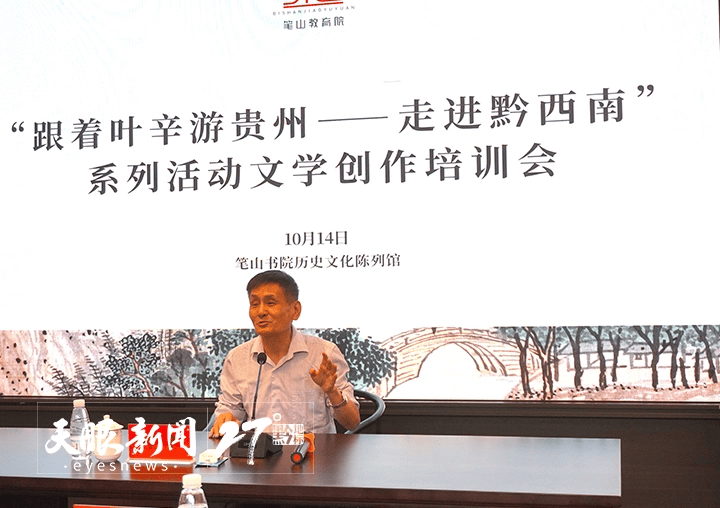 在兴义市笔山书院举行的文学创作培训会上,,叶辛与黔西南的文友分享他的文学追求经历和创作心得,深度剖析文学创作与时代脉搏的共振关系。从素材积累到情感表达,从生活认知到创作激情,每个方面都包含着这位著名作家的贵州情义。贵州省文艺评论家协会会员、黔西南州文艺评论家协会副主席张朝阳表示,叶辛老师说的“创作需要善于捕捉生活的新意、时代的新意”,给大家的创作以很大的启示。中国作家协会会员、黔西南作家协会副主席万松表示, 叶辛老师的点拨,对黔西南州作者的创作很有帮助。