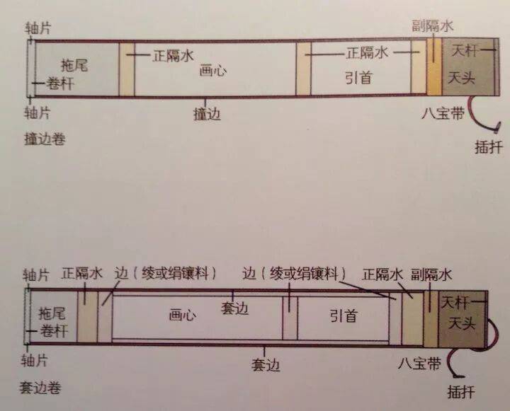 手卷(上图),主要用于在桌面上欣赏,体积较小。画幅的前、后,特别是后面留有相当长的空白,供欣赏者题写赞语或鉴定意见。外有“包首”,“包首”之上贴有“题签”。前有“引首”,中为“画心”。紧连画心两边的是“隔水”,后有“拖尾”。