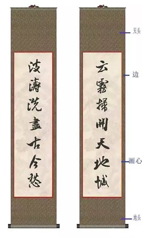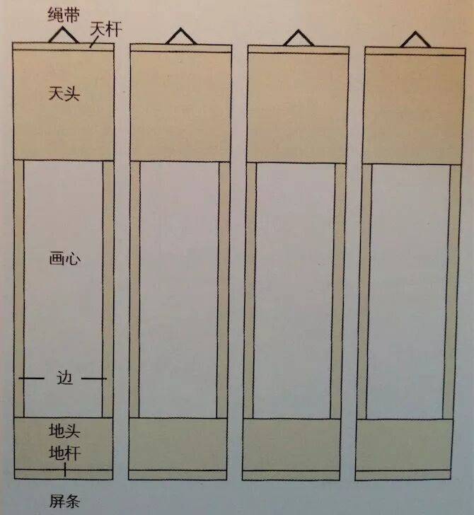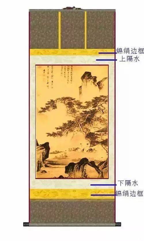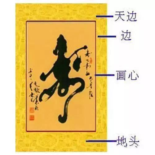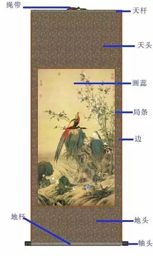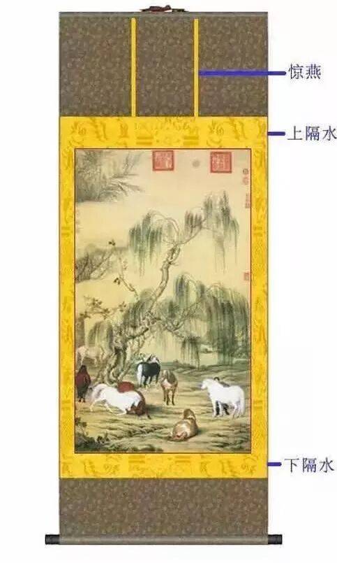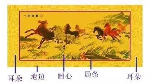 起初“惊燕带”不贴实,能飘动,后贴实,纯为装饰。“画心”上下端可加镶锦条,称“锦眉”,亦称“锦牙”。悬挂在厅堂正中的大副字画还称“中堂”。