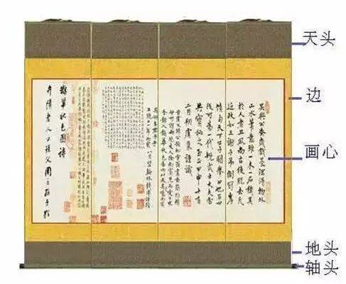 立轴(上图),主要用于竖式构图,悬挂欣赏。画幅的上下左右常常有文人或收藏家题字赞赏。中间部分称“画心”,上有“诗塘”、“天头”,下是地脚。上下又有“隔水”,有的天头贴“惊燕”。