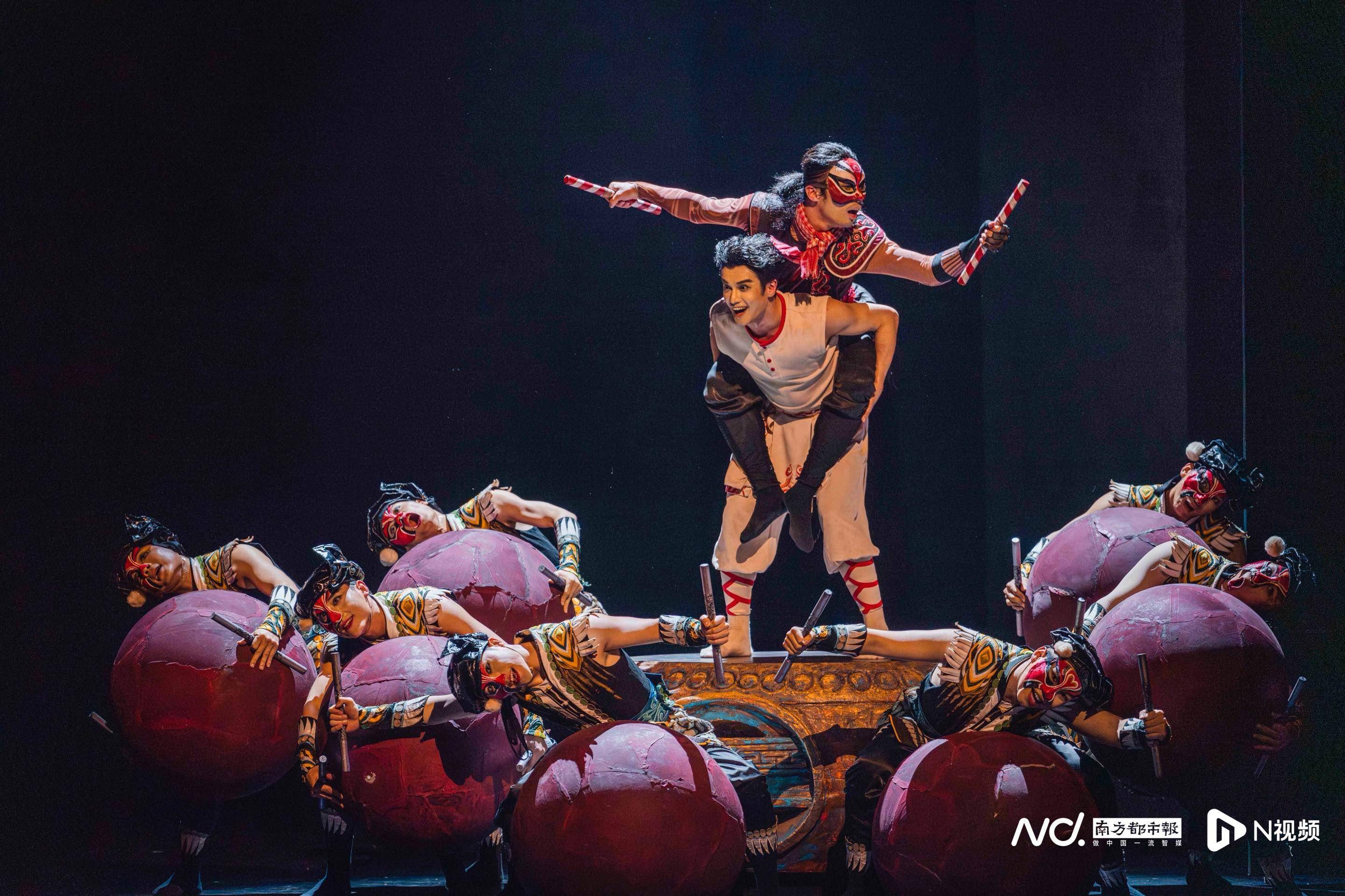 剧中核心道具“英歌槌”亦能一物多用:比如在木雕的段落里,它可以化作匠人手中的刻刀;在“牛肉丸”的舞段中,它就是击打肉泥的小铁槌;在耕种的场景里,它又变成了绿油油的秧苗。在大英歌的群舞中,演员们击打红色鼓槌,契合了舞剧想要表达的传承千年的民族精神。