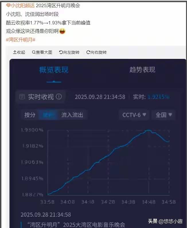 9月28日的大湾区音乐节上,一个18岁女孩的表演让整个华语乐坛为之震动。当沈佳润以全开麦状态完美演绎《美美桑内》时,连成龙、王力宏、孙楠等乐坛前辈的光芒都被她盖过。实时收视数据显示,小沈阳与女儿同台演出的时段创下了整场音乐会的收视巅峰。