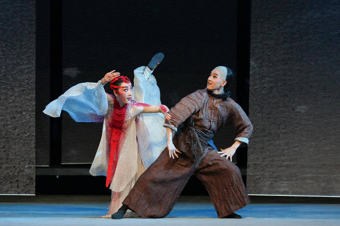 该剧还重点描绘了齐白石在“衰年变法”中的心路转变,创造性地设置了“神思”与“尘想”两个虚拟角色,充分展现了人物内心挣扎与艺术蝶变。舞台上,“尘想”以武丑应工,“神思”以花旦应工,展现了弹板、空翻等一系列繁难技巧。“尘想”与“神思”的对打厮杀,将京剧传统武戏的开打,辅以光影技术,极大丰富拓展了京剧人物角色的表达手段。