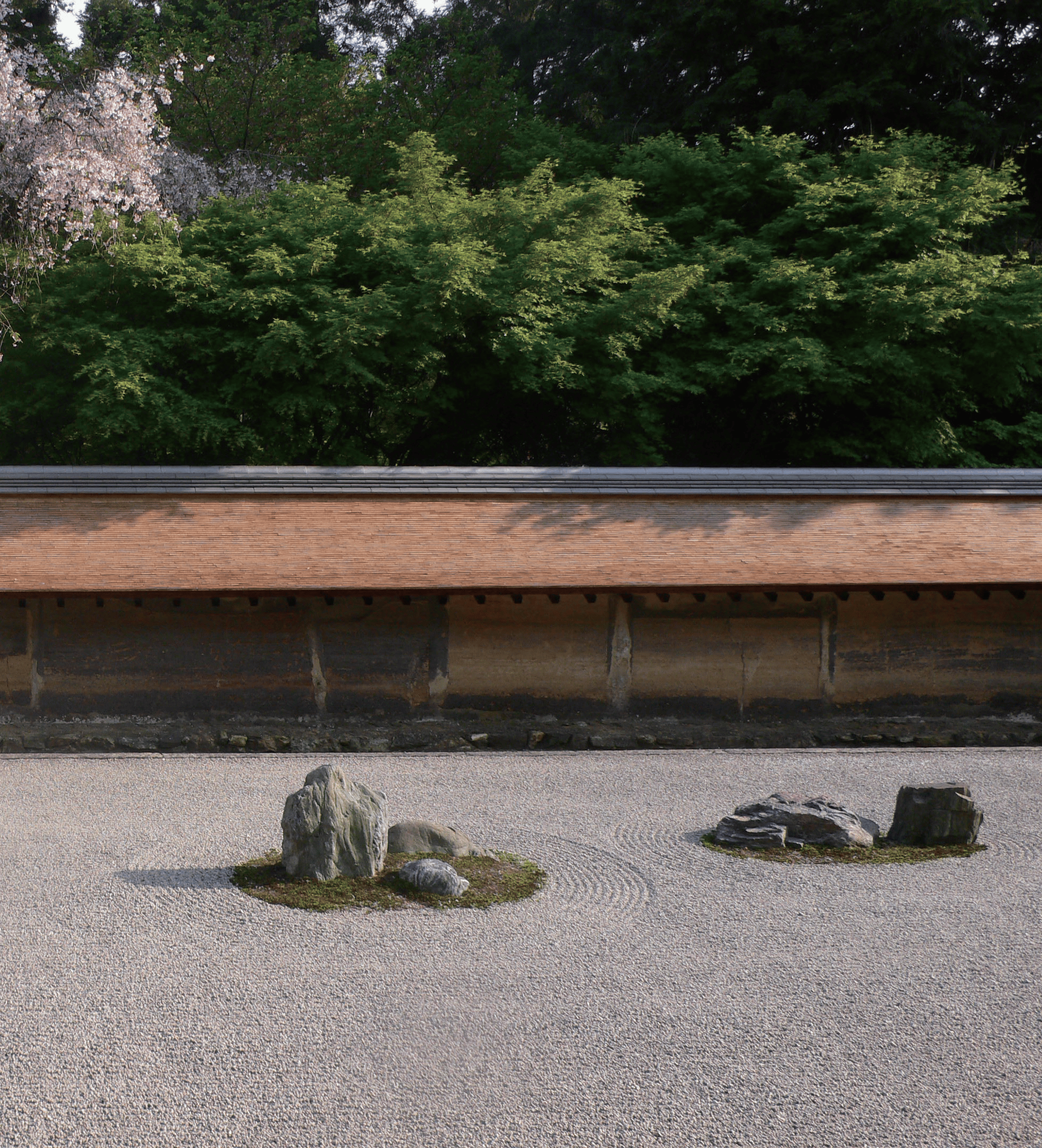 在我看来,无论关于枯山水有多少传说,都可以从两个层面来解读其含义:第一个是视觉层面,枯山水是对自然形态的模仿,以白砂象征山涧激流或大海波涛,以石块象征高山和岛屿;第二个是精神层面,高度抽象化的白砂与石块令人静观与冥想,除了空间关系之外还有时间的存在,人们通过静坐、观赏和内省,感悟精神世界。因此,从整体上看,枯山水表现的是广袤无垠的自然世界和内心幽幻的宗教境界。