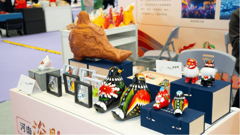 步入“古镇新生态”展区,鹤壁元素格外引人注目。浚县展台前,国家级非物质文化遗产“泥咕咕”以其古朴可爱的造型吸引了众多目光。不仅有传统的生肖系列,更有经过创新设计的“会唱歌的泥咕咕”,其内部巧妙结构能吹出清脆哨音,引得观众纷纷尝试,在互动中感受千年古艺的新生。