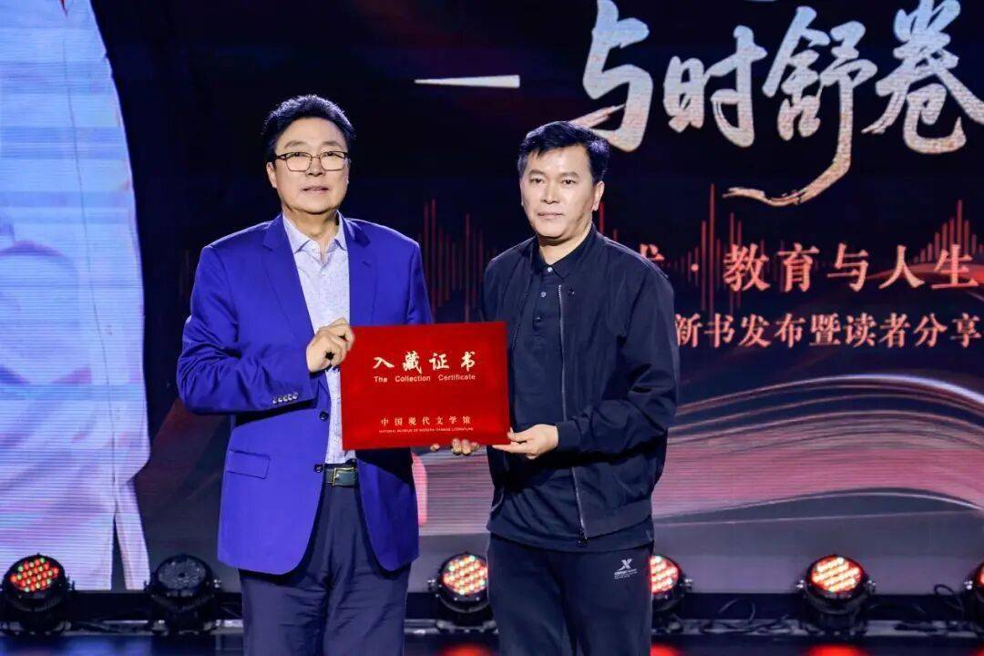 随后,“致敬与祝福”环节迎来了又一庄严时刻。中国现代文学馆征集编目部慕津锋主任登台,郑重为李罡教授颁授了馆藏证书。这一仪式标志着《艺术·教育与人生》这部心血之作被国家级的文学殿堂——中国现代文学馆、中国国家图书馆永久收藏,正式成为当代中国文学记忆的一部分。慕津锋主任在讲话中高度评价了该书的文学与史料价值,为其文学地位奠定了权威的基石。