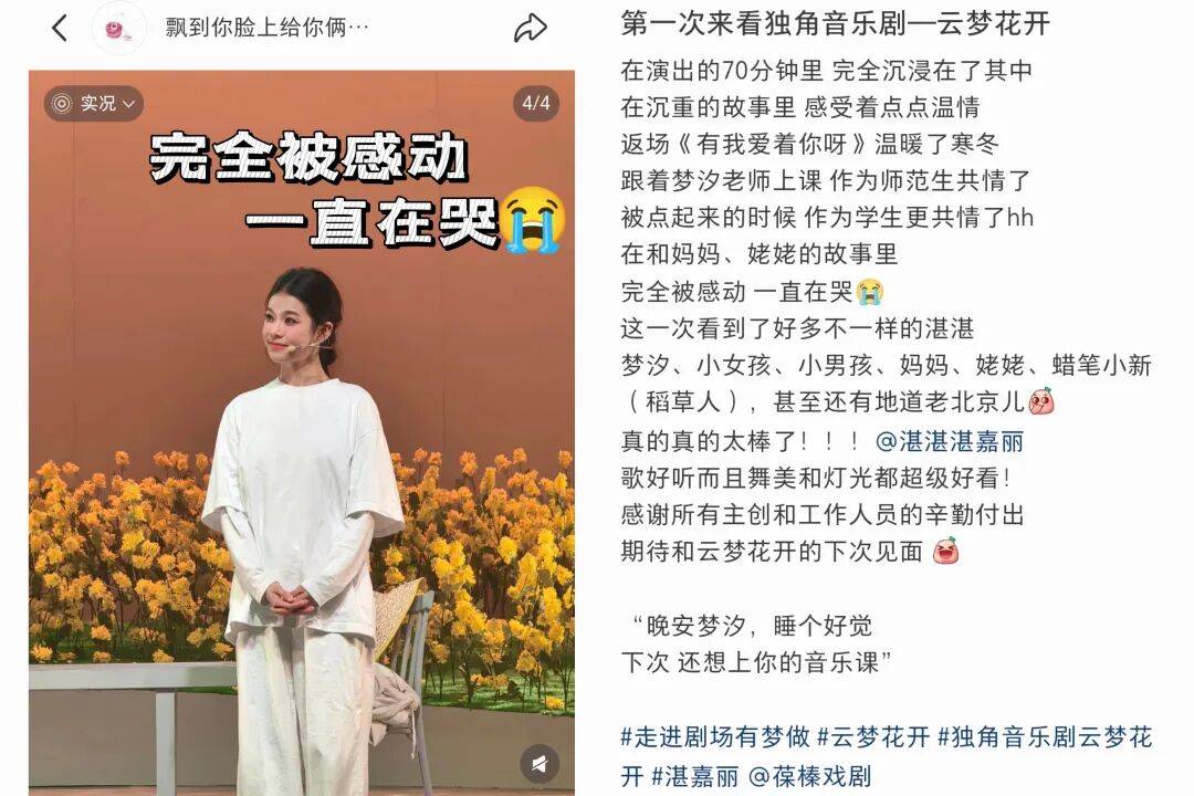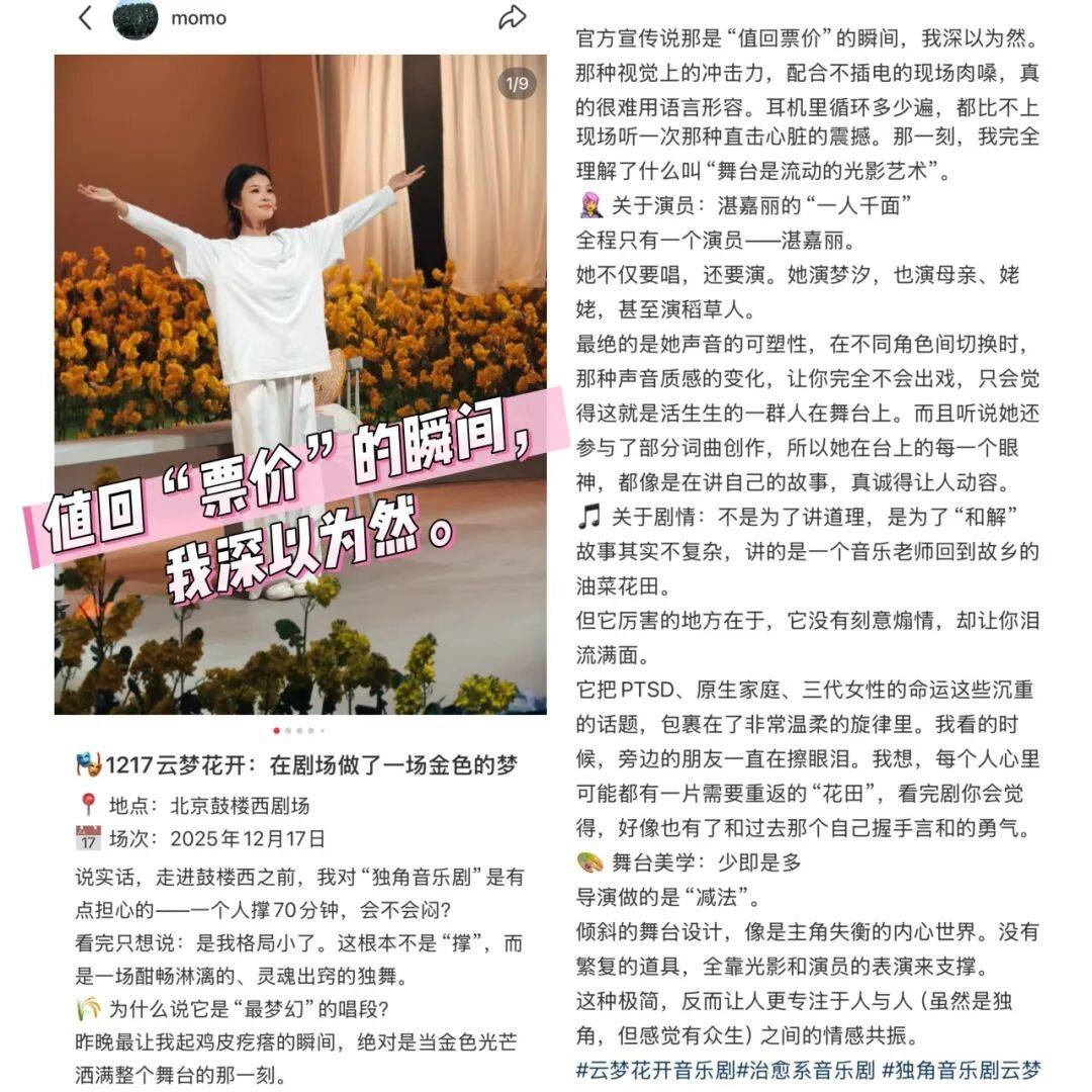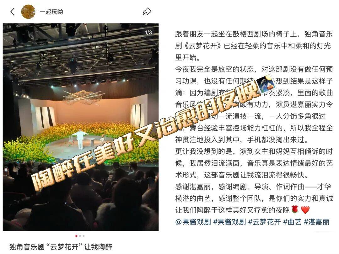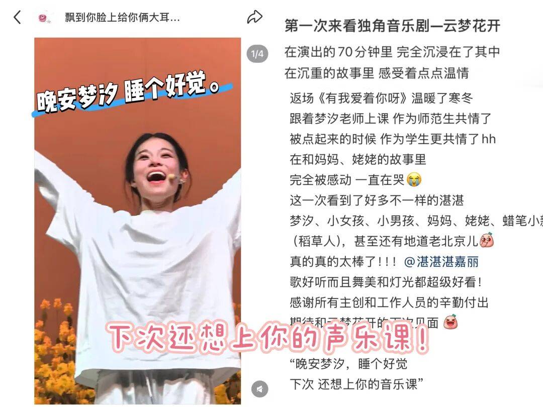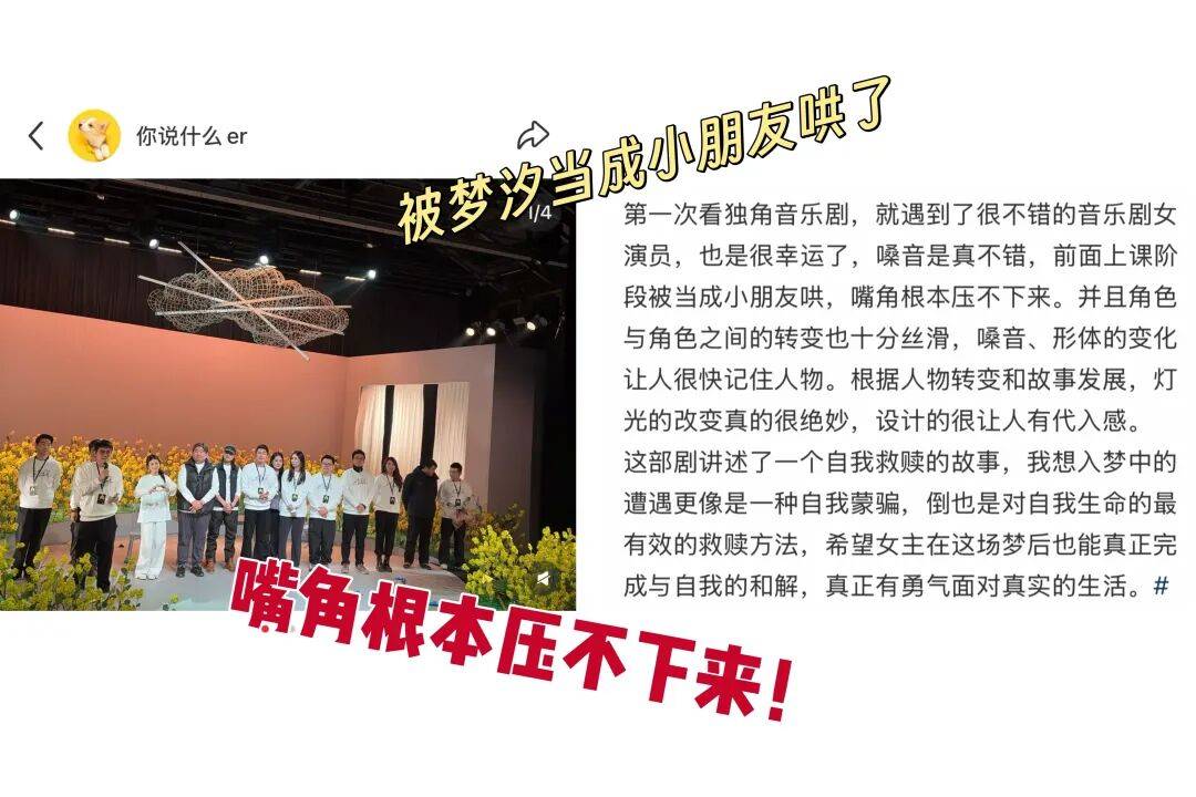 首演现场,剧情的层层推进、演员的深情演绎与音乐的感染力让观众全程沉浸,掌声与赞叹声此起彼伏。不少观众在观演后动情表示:"看着梦汐慢慢自愈,自己也仿佛经历了一场疗愈,最后一首歌直接戳中泪点""独角戏能有这样饱满的呈现太惊喜,每首歌都耐听,表演更是无可挑剔"。