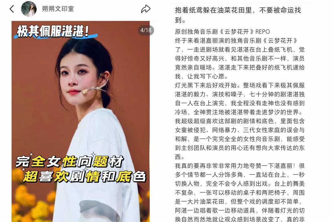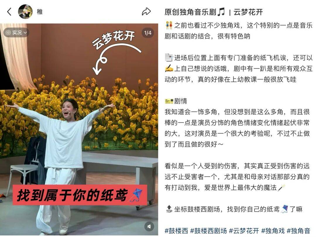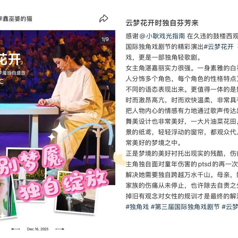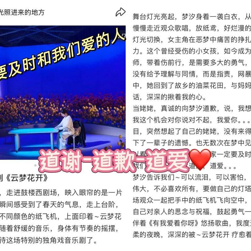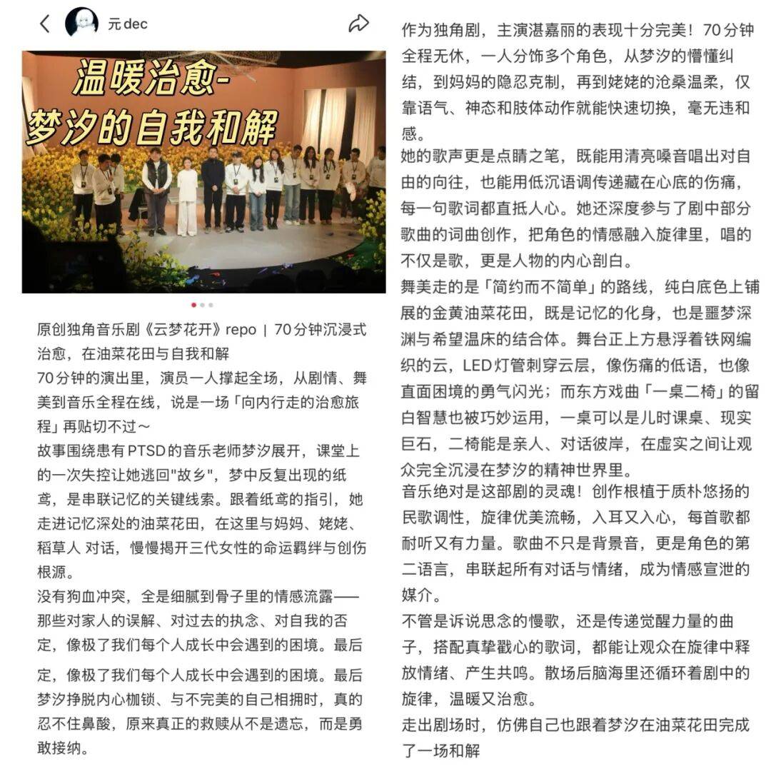 作为一部聚焦心灵治愈的诚意之作,《云梦花开》以独特的艺术表达叩击观众心弦。剧目讲述了患有PTSD的音乐老师梦汐,在梦中纸鸢的牵引下重返记忆里的油菜花田,于亦真亦幻的场景中与家人、过往的自己对话,最终梳理伤痛、完成自我和解的动人故事。这不仅是一段关于接纳与成长的心灵旅程,更是一曲拥抱自我、向阳而生的温暖赞歌,让每位观众都能在剧情中看见自己的影子,获得情感共鸣与精神力量 。