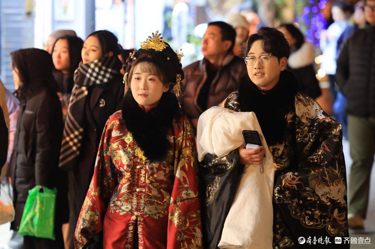 1月2日晚,济南百花洲热闹非凡,众多身着汉服的外地游客在此拍照打卡,成为一道亮丽风景线。正值元旦期间,济南天气晴好,气温虽低,但游客们热情不减,穿梭于古色古香的百花洲,感受着济南的冬日韵味,为这个元旦小长假增添了一份别样的浪漫与活力。 齐鲁晚报·齐鲁壹点记者 王鑫