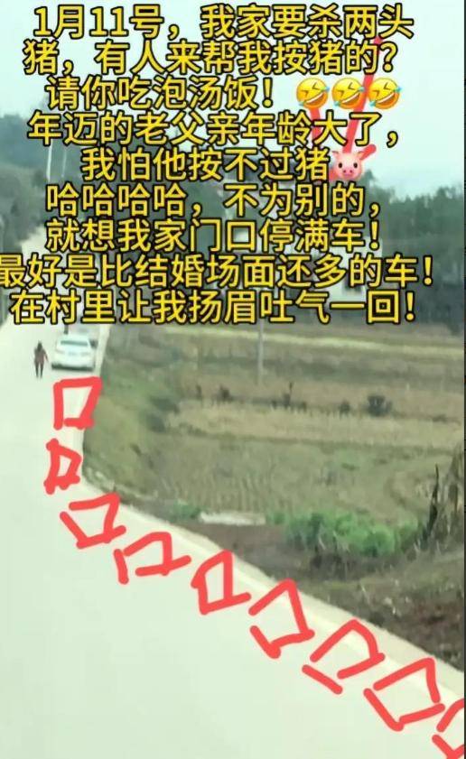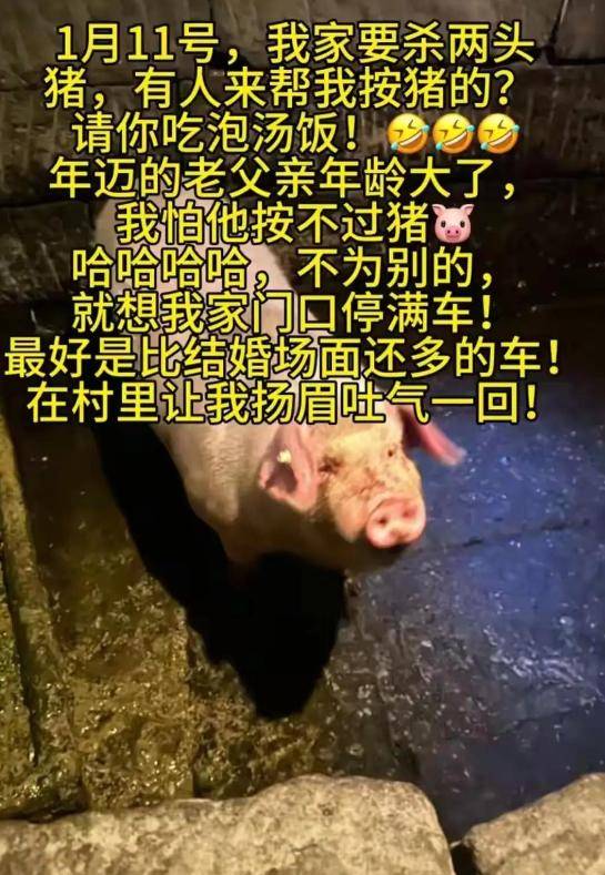 1月9日,她发布视频并配文:“爸妈快70了,11号杀两头猪按不动,谁来帮忙?请吃热乎刨猪汤!”