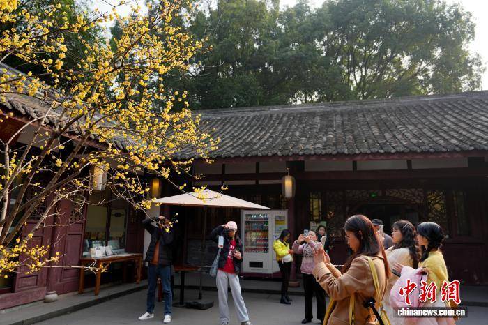 1月12日,成都杜甫草堂梅花绽放,引来众多游客参观游览。图为游客在杜甫草堂拍摄蜡梅花。中新社记者 安源 摄