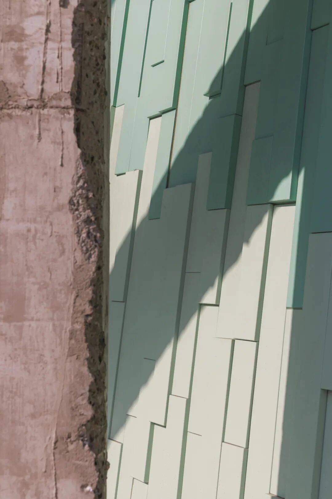 金属幕墙采用四种色彩与厚度的金属板,并在施工中通过采用V型板统一角落厚度,解决了阴阳角的施工难题;屋面则以金属网围合出梯形,暗示着外立面山体的延续与层次感。