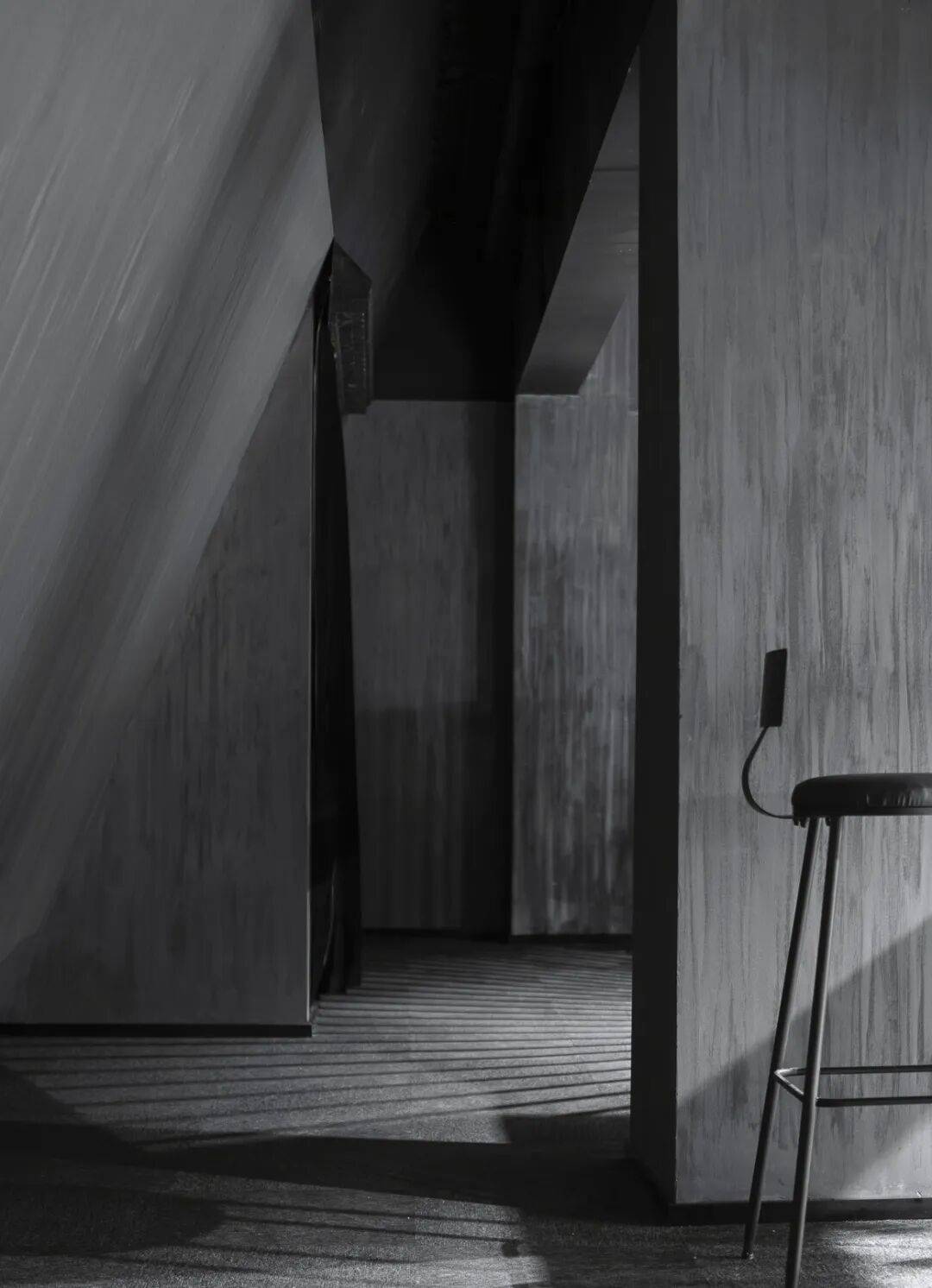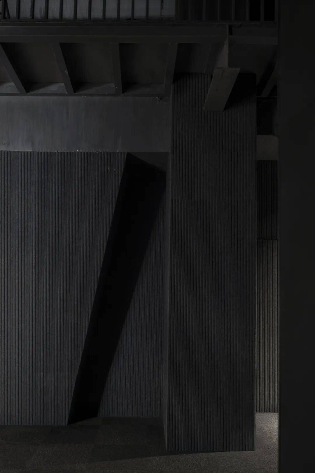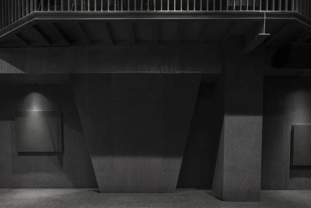 一层墨色山影连绵,一侧设有售票处与吧台,另一侧则为化妆间;二楼设有监控室,并通过北侧外部楼梯联通屋顶。对旧混凝土结构、新夹层及装饰层分别采用不同处理方式,强化了新旧对比:粗犷与细腻在此交织,机电、舞台装置与灯光布局也经过精心整合,尽量保证夹层的净高。