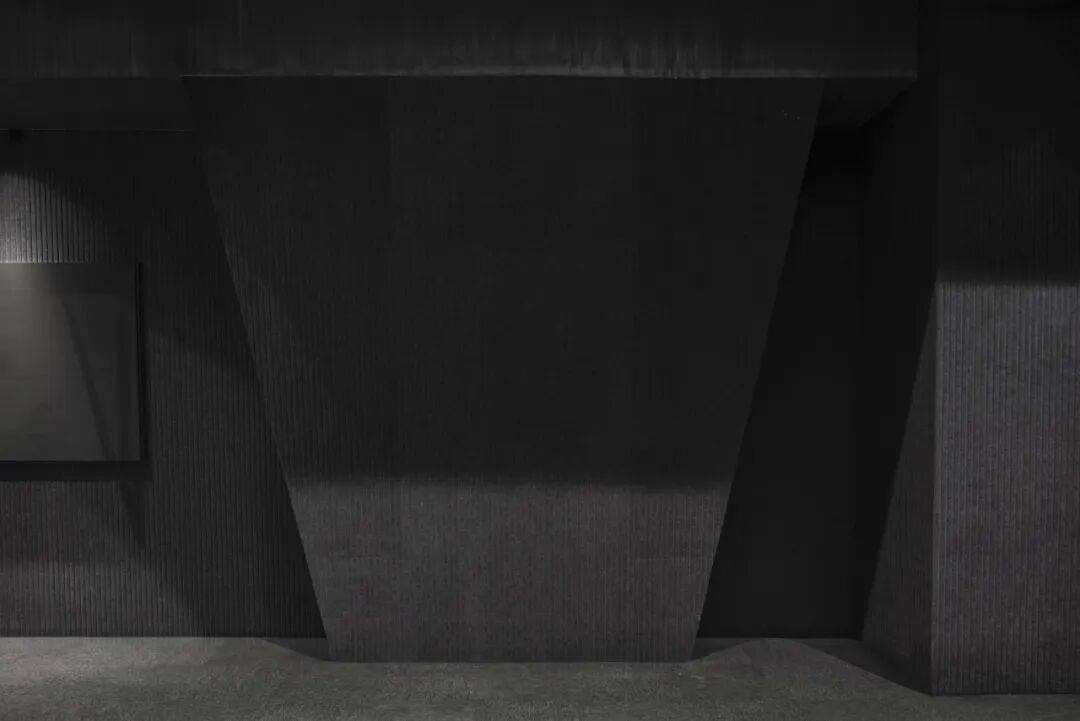 室外以青绿山水为景,室内则呈现黑白山水的简约之美。设计中借鉴国画“皴法”笔触,利用吸音板与艺术涂料刻画出纵向肌理;增设夹层,其轮廓与一楼倾斜墙面遥相呼应,营造出仿若步入深山的沉浸式体验。