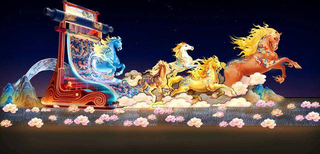 本届灯会注重“文化引领”,将呈现40余组彩灯,其中4组为12米及以上的超大型灯组,通过动态机械与声光电等技术应用,营造震撼人心的视听效果。在灯组设计上,巧妙挖掘表达历史文化与在地资源:有创意源自“五星出东方”蜀锦护膊的《神骏出东方》马年主题灯组,有反映蜀道文化的《五丁开蜀道》灯组,有创新表达三国文化的《人也,神也,仙也》灯组,有植根成都本地唐宋商业文明的《十二月市生肖闹》灯组,有刻画成都历史文化地标的《成都锦绣》灯组,有突显龙泉驿驿马文化、客家文化和桃花文化的《茶马远行织锦绣》《牧童遥指客家村》《人面桃花相映红》灯组,有用光影书写的诗词名句《千秋名句满庭院》《此心安处是吾乡》《缘来桃花笺》《稻花香里说丰年》灯组,精准、生动地展现深厚的中华历史文化底蕴。