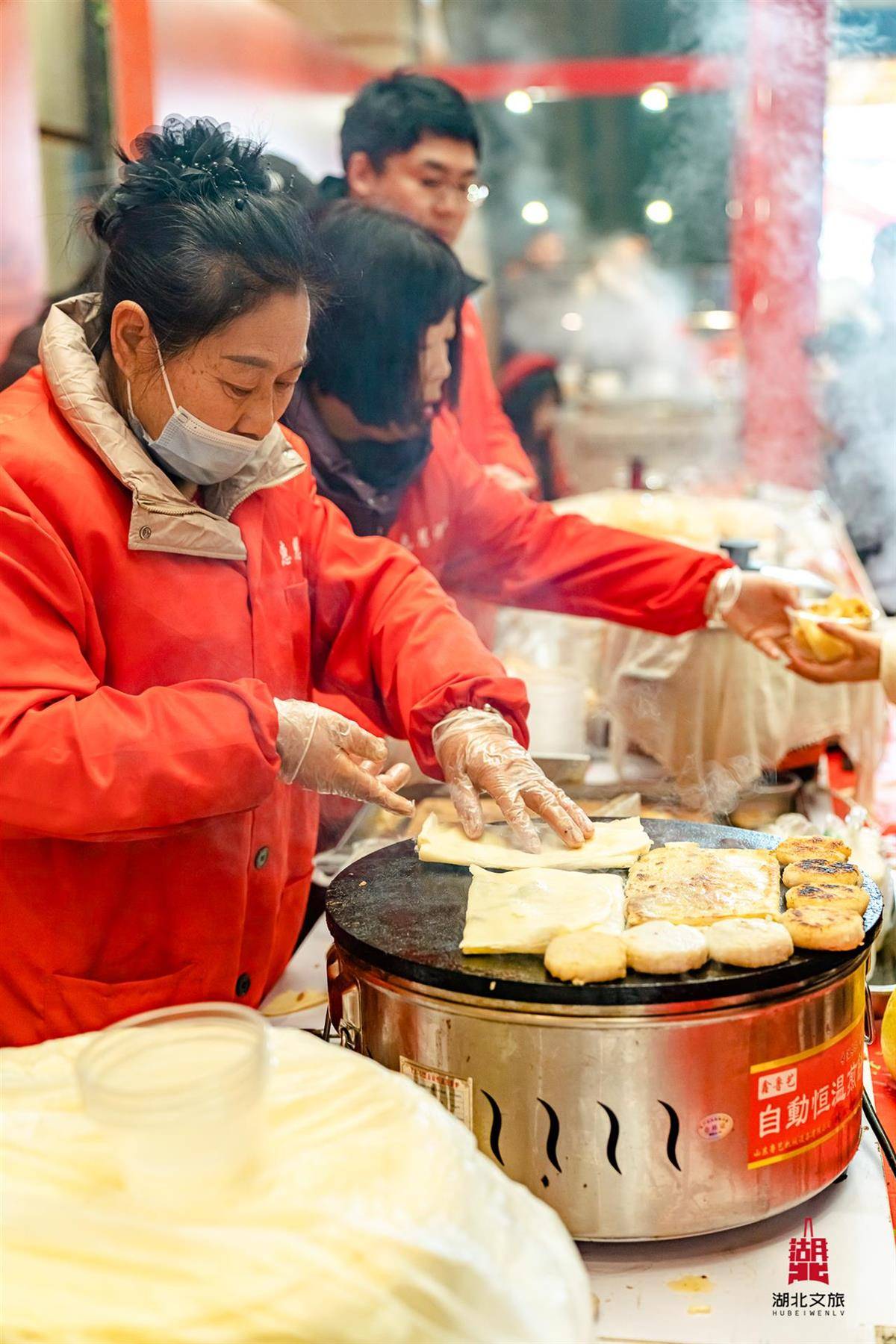 湖北各地特色风味更是让人垂涎欲滴,孝感麻糖咬上一口,芝麻香混着麦芽糖的甜香在口中迸发,酥脆口感越嚼越香;潜江鱼圆裹着鲜美的鱼汤,入口Q弹滑嫩,一口咬下满是鱼肉的鲜甜。扬子江传统糕点松软细腻,豆沙、桂花等经典馅料甜而不腻,尽显老武汉风味。蒸糕白白嫩嫩,带着大米的清甜,咬开后热气裹挟着香气溢出,软糯不粘牙。芋头圆子外皮Q弹,内馅饱满,煎至金黄后外酥里糯,带着芋头的清香。黄潭米粉细滑筋道,浇上鲜美的骨汤和秘制臊子,撒上香菜、酸豆角,一口下去暖透心间……每一款美食都承载着地道的荆楚年味,让市民在舌尖上品味乡愁。