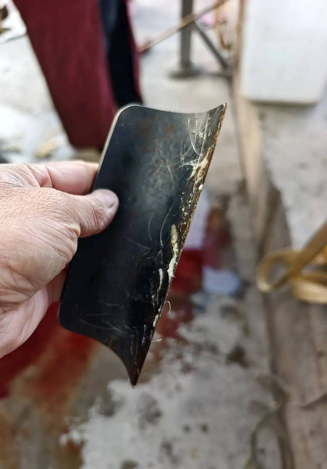 刨猪汤的“刨”,没人比杀猪匠更懂。用木塞堵住猪脖子处的伤口,长针从猪后腿接入,放完血的猪会被打气筒吹胀,然后浇上70摄氏度的热水,此时,一张巴掌宽、略带弧度的铁皮,将猪毛刮落,这个过程,便为“刨”。没有刨干净的,亲友们会用镊子细细处理。