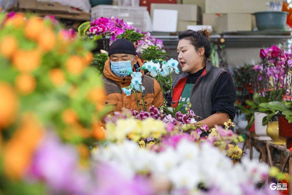 人们在山东省青岛市李沧区李村大集选购年宵花。
