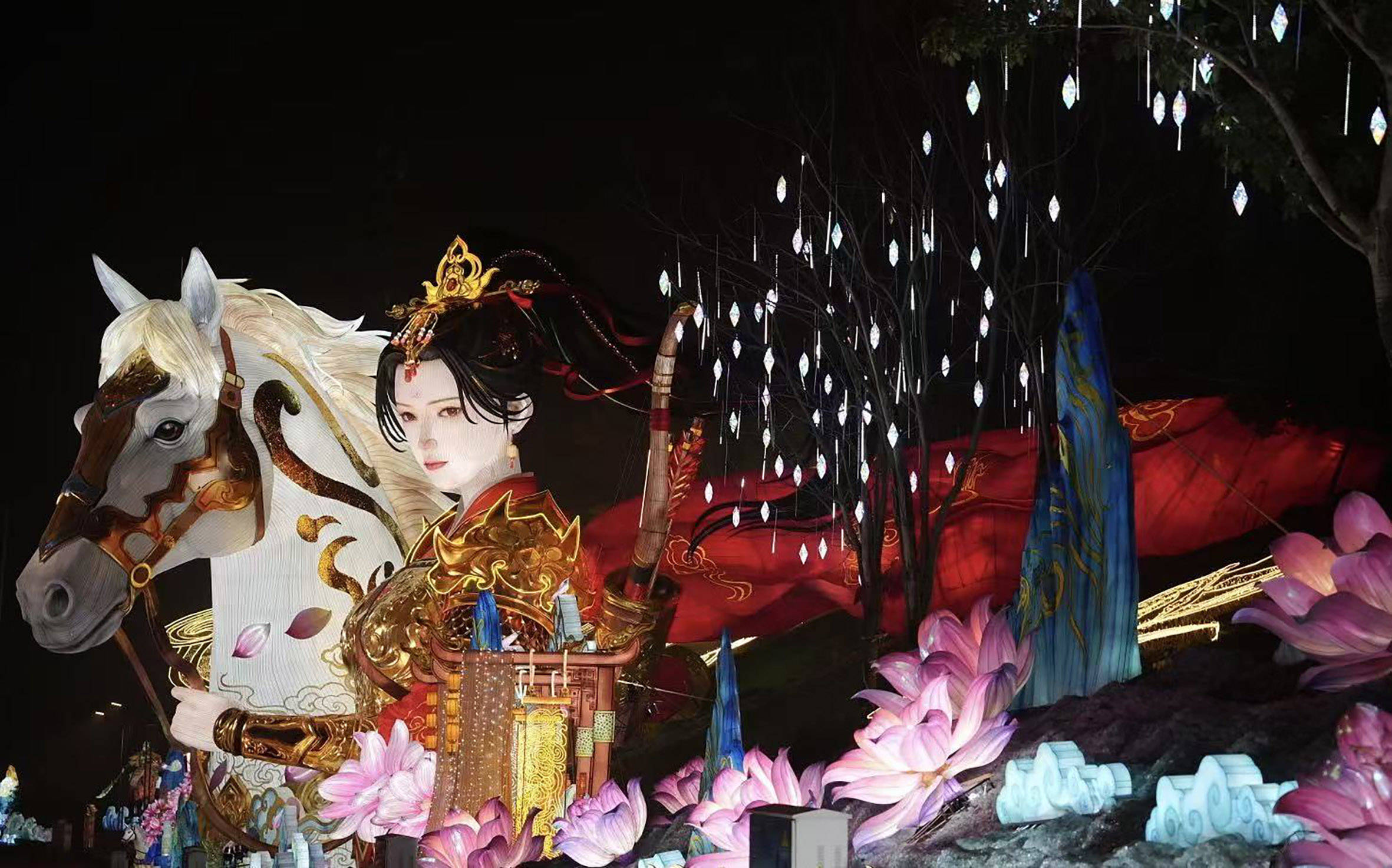 如果说“神奇华夏”彰显的是华夏神话的宏伟壮阔,那么“木兰传奇”灯组则聚焦历史故事的温情与豪迈,为这场灯会增添了浓厚的人文底蕴。该灯组以180米长、18米高的宏大篇幅,按“织甲赴戎行—木兰传奇—木兰荣归—新年团聚”递进场景,完整再现木兰从军史诗。从“唧唧复唧唧”的织机光影,到核心区域身披金甲的木兰立像,再到50米荣归画卷与诗意收尾,全灯组以彩灯为笔,将家国情怀、女性成长与春节团圆融于一体,带来直击人心的震撼。