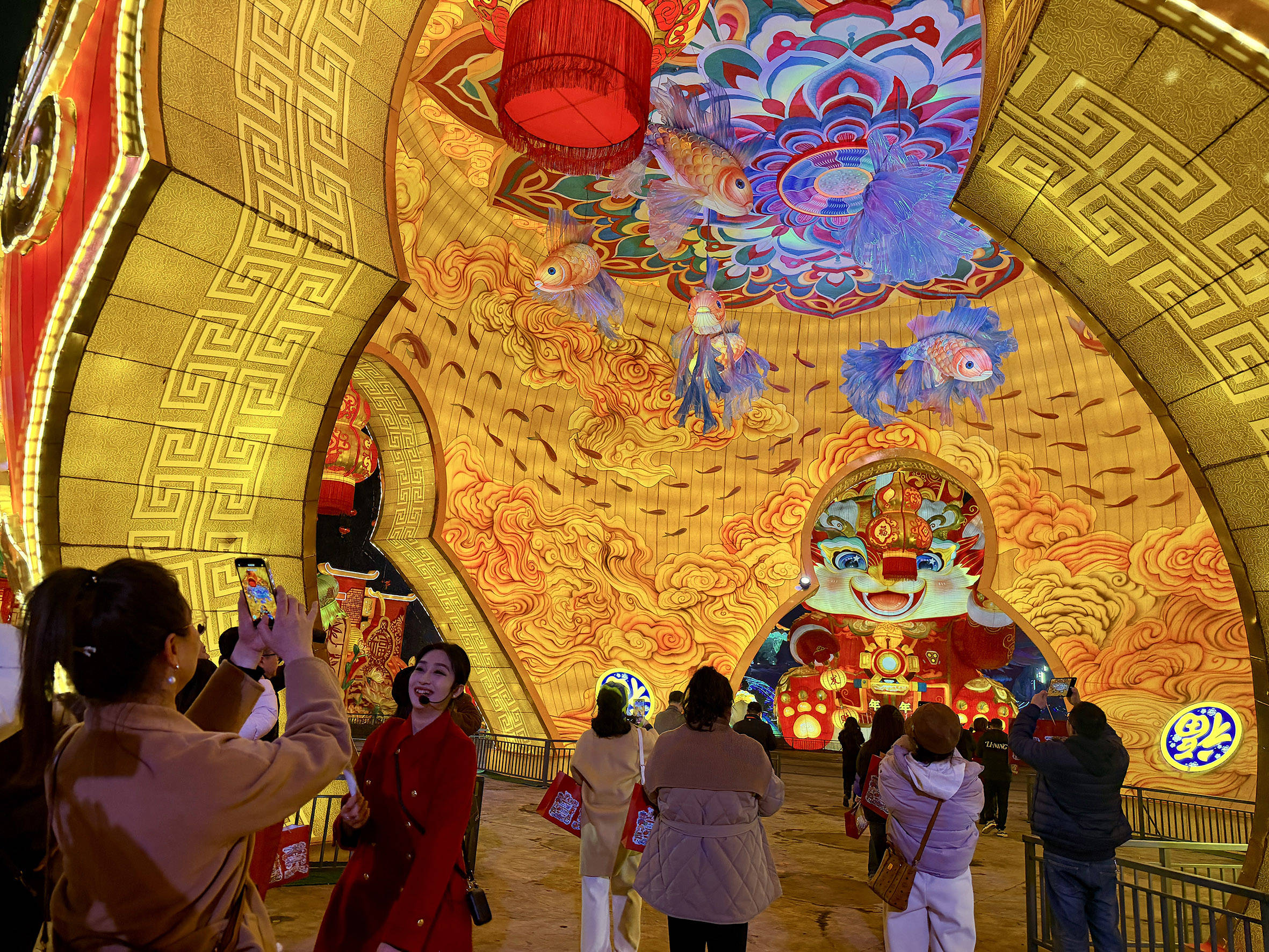 多个互动灯组中,“年年招财”与“福禄双至”灯组尤具代表性。“年年招财”灯组植入中远场语音交互技术,即便在喧闹环境中,年兽也能精准应答游客,实现跨越时空的亲切对话。30米高的“福禄双至”灯组则彻底打破单向观灯模式,邀请游客走入葫芦内部,沉浸式体验“身在福禄中”的奇妙感受,让观灯乐趣再度升级。