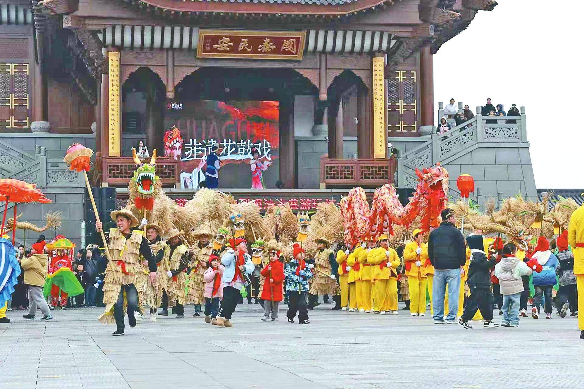 今年元旦,迎风桥镇的两条稻草龙亮相明清古巷。领队贺中秋介绍:“一条龙头为绿色,代表风调雨顺,一条为黄色,代表五谷丰登。”腾飞的龙,舞出了人们对美好的向往。当龙的身姿与人一齐舞动,鳞甲映衬着笑脸,鼓点与掌声合衬,那团名为“年味”的热浪变得具体可感。