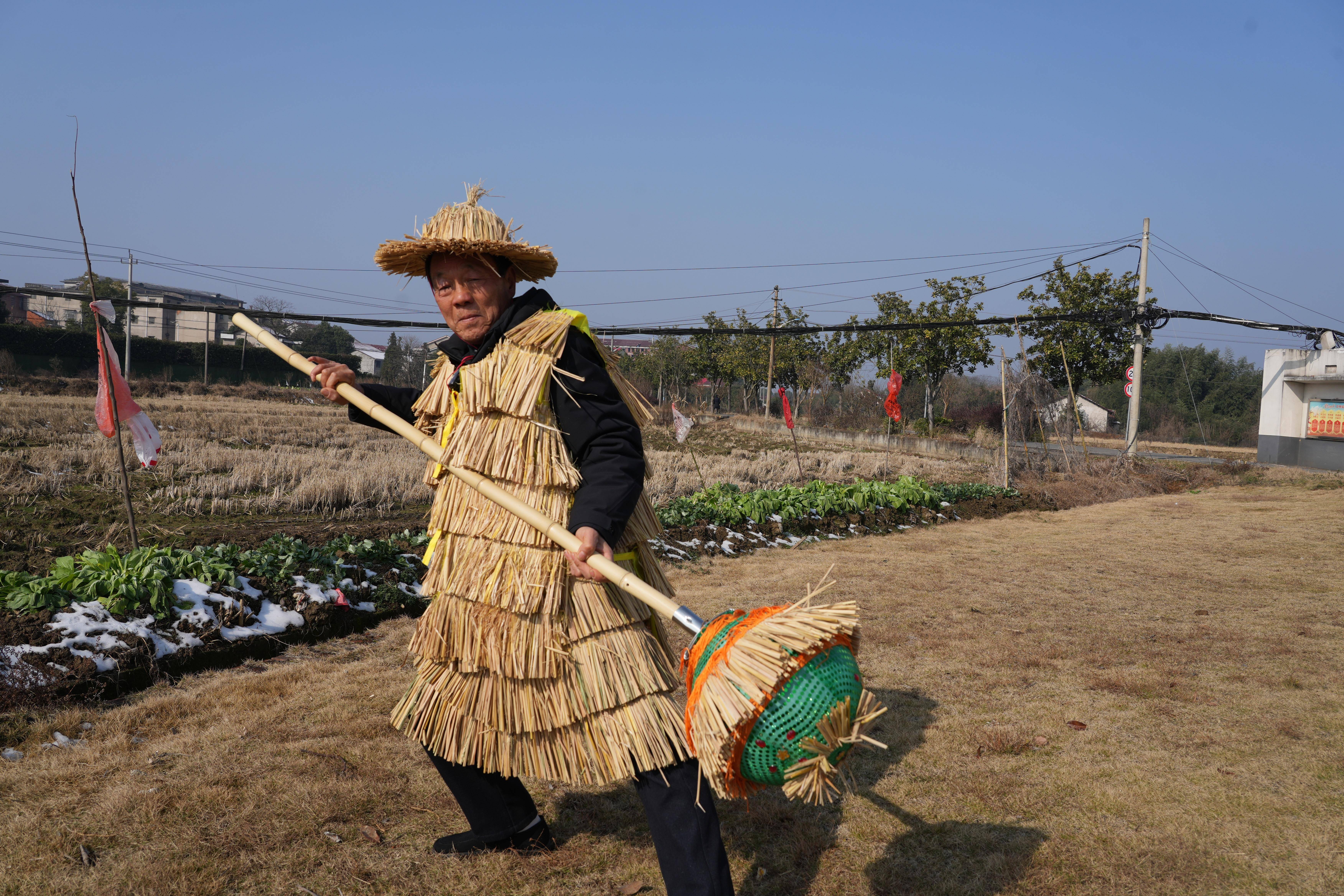 天作幕布,地为舞台。老人步伐腾挪,身手飒沓如风。一招一式间,身披的草衣仿佛化为了鳞甲,和坚毅的眼神一齐闪着光。