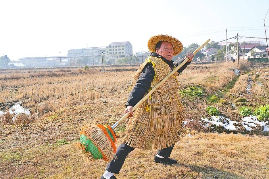 “制作一条草龙可不容易!”郭孟仁由衷感叹。作为迎风桥镇唯一还会制作稻草龙的手艺人,他最有发言权。“从选料开始就讲究。稻草要金黄色的,不能有腐坏、斑点,还要秆长、韧性好。然后用耙梳理枯叶枯皮,只留茎秆。接着是缠草、扎把、组装、点睛……前后十余道工序,需要好几个熟手一起忙上数日。”郭孟仁抚摸着亲手制作的稻草龙,眼神温柔。