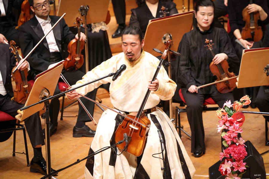 音乐会上,哈斯巴根原创的马头琴与乐队狂想曲《念》迎来世界首演,这首作品将欢腾的新春氛围,悄然转向豪迈深沉的故土情思,为音乐会增添浓墨重彩的一笔。哈斯巴根创作这首作品的灵感,源于2007年海外求学时对家乡的深切思念,他运用马头琴独特的五度定弦与传统塔拉嘎演奏技法,融入蒙古族古老的呼麦艺术,让辽阔的草原声景与绵延的乡愁,透过乐声缓缓流淌。
