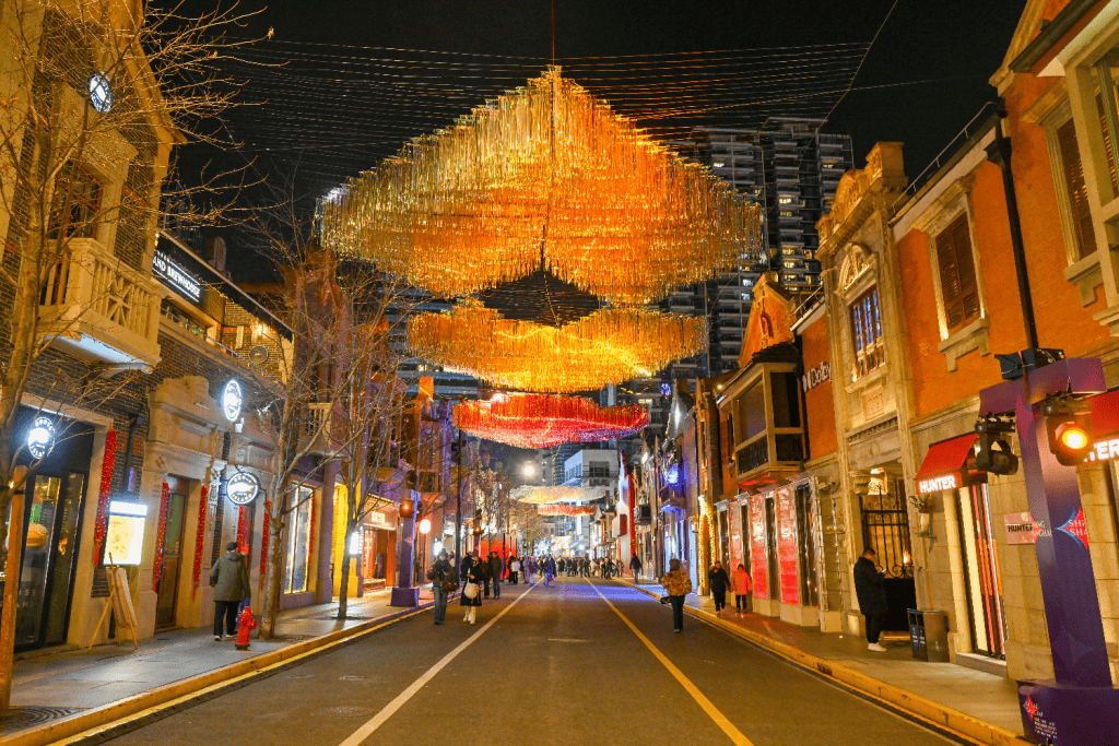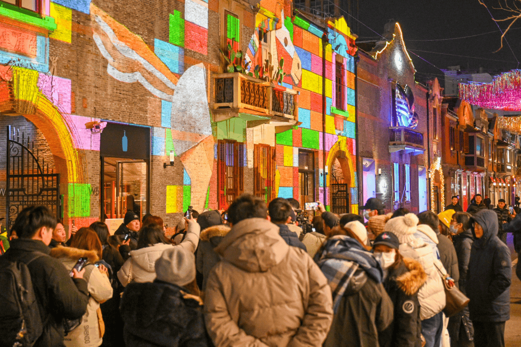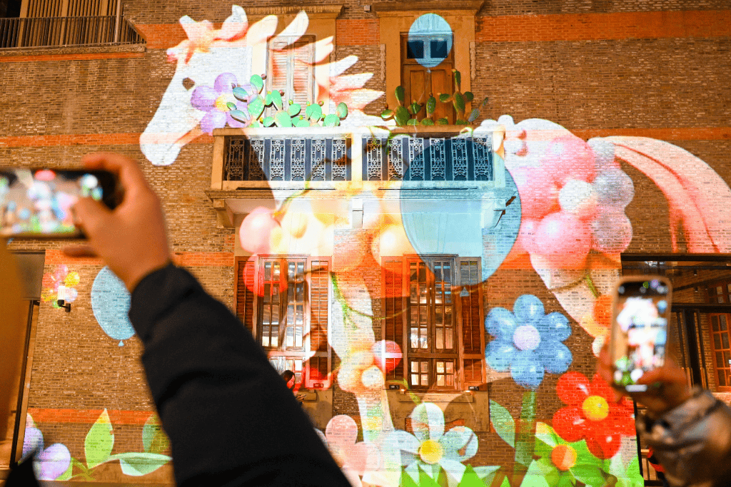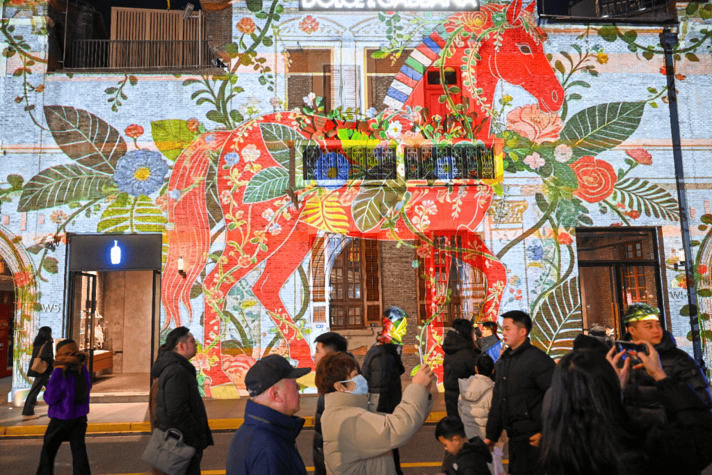 当夜幕降临,张园便转入另一重绚丽维度。2月15日至23日每晚5:30至9:30,第四届“闪亮·上海”静安国际光影展(2026)之“闪亮·静安 光影 SHOW 新春”华彩登场。徐悲鸿名作《奔马》化作“天河奔马”镭射光影,在百年清水山墙上,奔腾不息,气势如虹;茂名北路则幻化为“五福临门”的流苏长廊,“新岁”激光球如千树花火凌空绽放,将石库门的夜晚,编织成一片璀璨而温柔的星河。