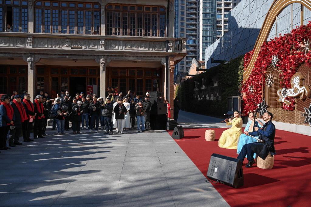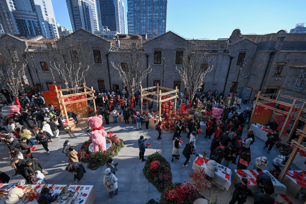2月8日启幕仪式上,中国龙狮九段、国家级非遗传承人陆大杰领衔龙狮献瑞,以“骏驰龙腾”之势巡游茂名北路;被誉为“最优美的中国乐团”上海民族乐团,在安垲第艺术墙前奏响经典曲目,非遗丝竹管弦勾勒出一幅生动的海派音画。在12号楼广场前,上海市书法家协会主席丁申阳、非遗撕纸传承人华兴富、版画艺术家金雯等亲临现场,传统技艺在指尖重生,重现张园历史上“游园观艺”的雅趣盛景。