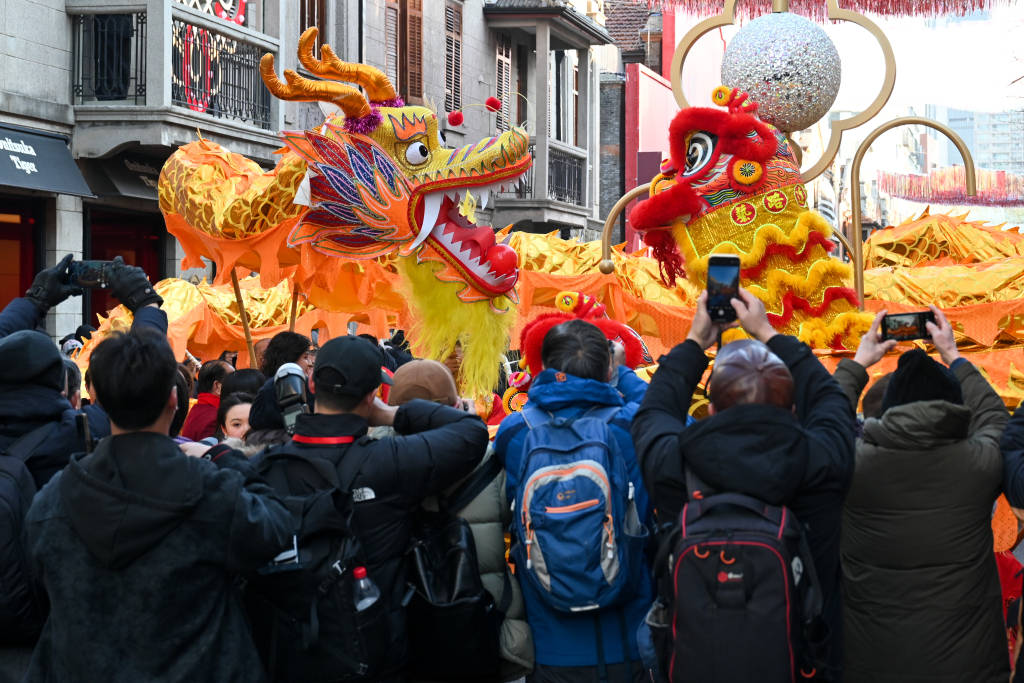 2026年2月8日,上海张园,舞龙狮吸引众多市民游客观看。澎湃新闻记者 朱伟辉 图