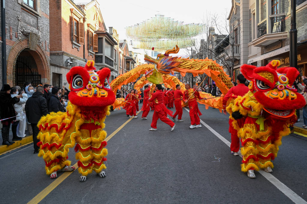 2026年2月8日,龙狮在茂名北路巡游。澎湃新闻记者 朱伟辉 图