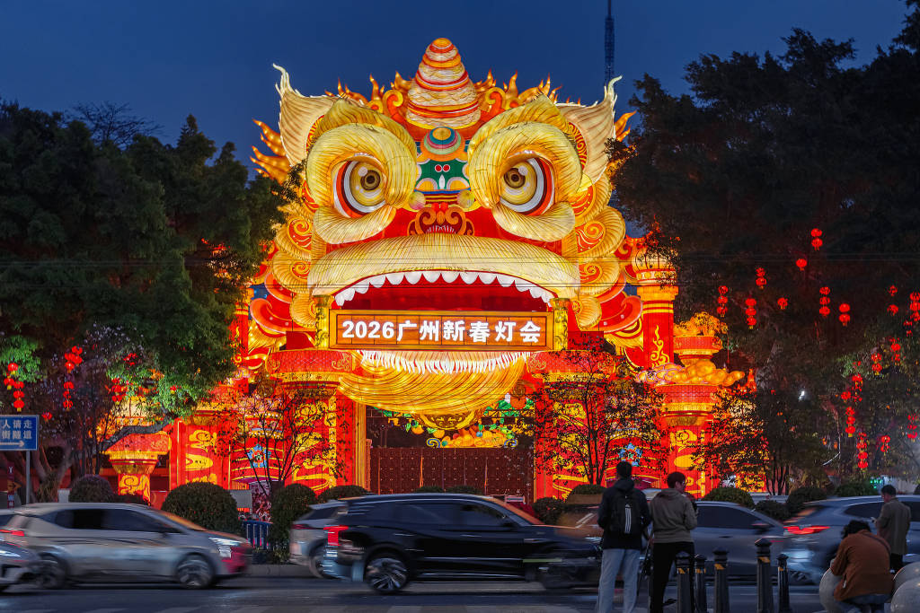 2026年1月30日,广东广州,“粤韵千年·四海同心”2026广州新春灯会启幕。图为以岭南醒狮为主题的20米高巨型灯组。视觉中国 图