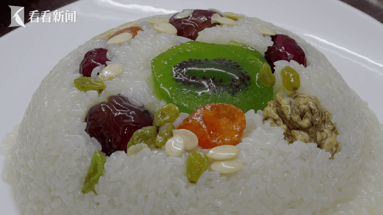 八宝饭上,核桃仁,红枣,蜜枣,葡萄干,瓜仁,蜜饯,金橘、莲子一样不能少。豆沙,必须是光明邨自己的配方,自己配料,自己制作。而“饭”,也得是鲜糯米和粳糯米按照固定比例调配,口感才最正宗。光明邨大酒家厨师长刘锦炎说:"现在市场一般对特甜的东西相对来说有一点怕,有点忌讳,所以说我们在口味上选择的就是味道浓而不甜的那种感觉。"