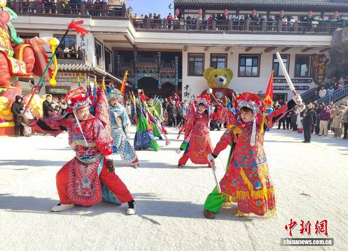 2月17日,在辽宁省本溪满族自治县小市镇同江峪村的小市一庄景点,本溪社火队表演走阵和群英对打。杨和清 摄