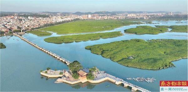 桥对岸远处,模糊看到城市高楼的景象。洛阳桥连接的不仅是两岸,更是泉州人从陆地走向海洋的坚定步伐。从两宋开始,泉州就有先人迁往台湾,到元末清初更有三次移民高潮,他们不仅把先进的生产技术带到台湾,也把闽南文化带到泉州,现在台湾的汉民,原籍为福建泉州、漳州二府的约占台湾人口的70%以上,泉州与台湾地缘相近,血缘相亲、文缘相承。泉州被联合国科教文组织评为世界遗产的还有“安平桥”“顺济桥遗址”“江口码头”“石湖码头”等。站在洛阳桥中央,顿生“江山留胜迹,我辈复登临”的豪情与沧桑。