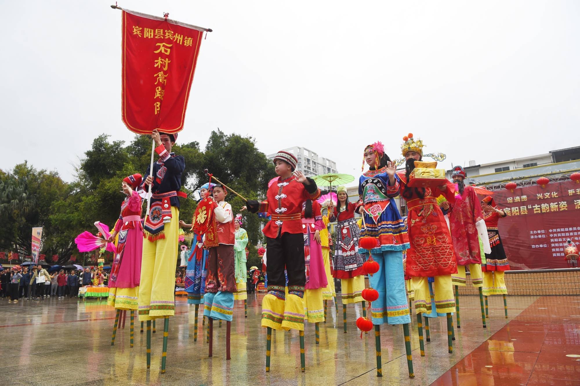 宾州镇石村高跷队身着民族服饰亮相,踩着高跷展现传统民俗技艺(央广网发 宾阳县融媒体中心供图)