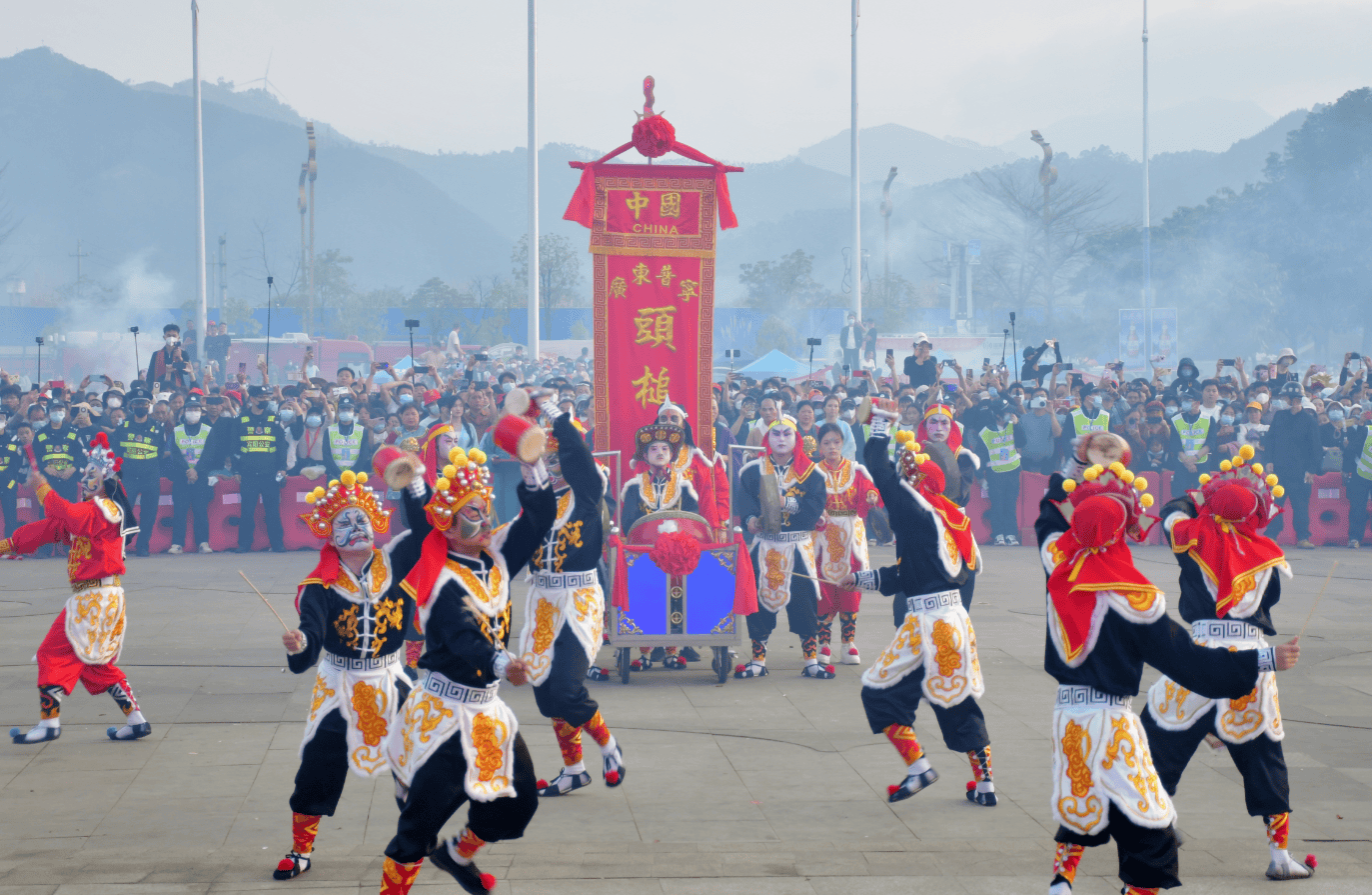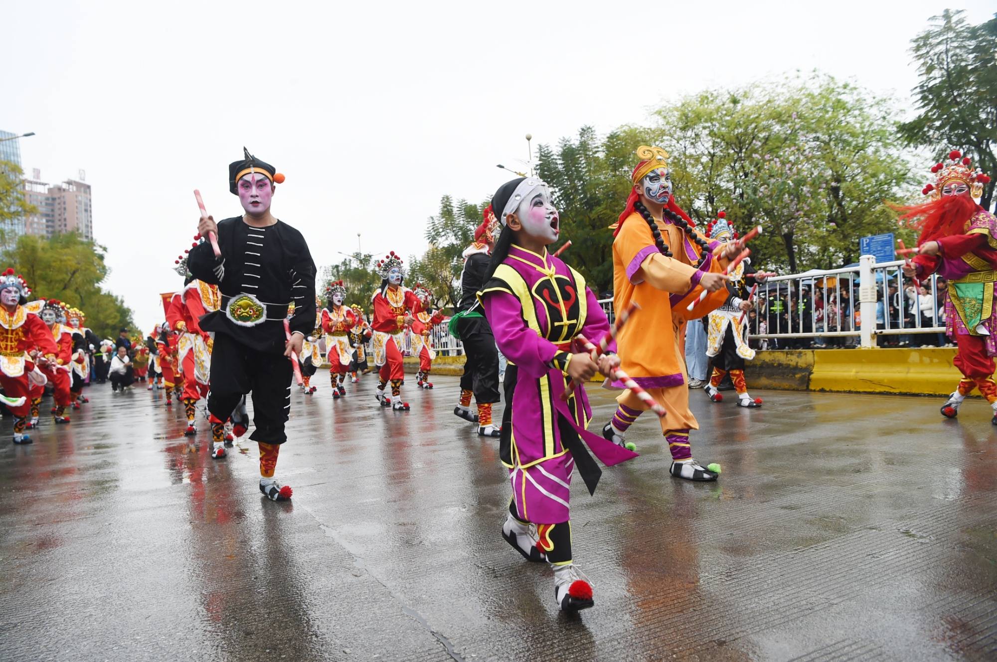 非遗巡游中,英歌舞队伍妆容鲜明、步伐刚劲,演绎潮汕民俗的独特魅力(央广网发 宾阳县融媒体中心供图)