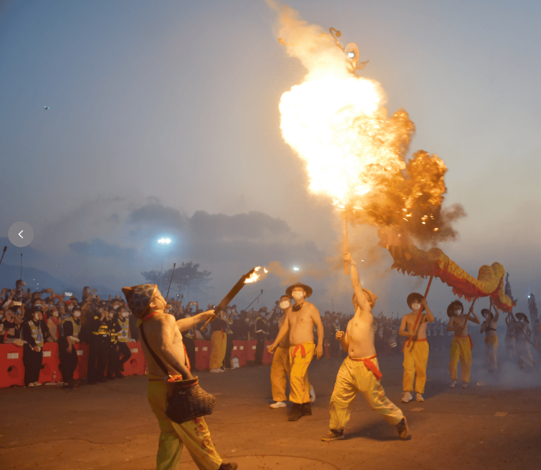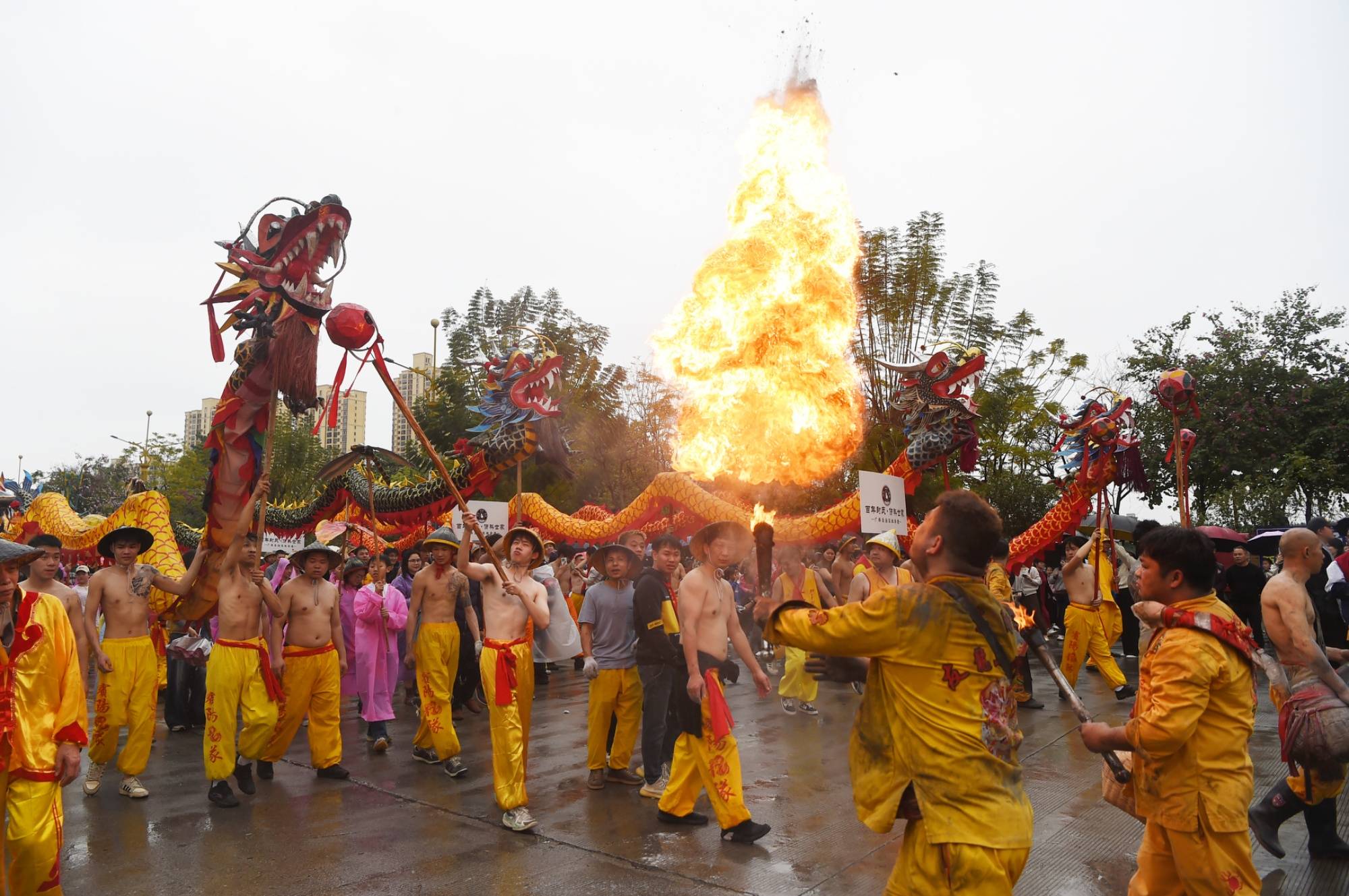 非遗巡游现场,舞龙者喷火助兴,炮龙腾跃引围观(央广网发 宾阳县融媒体中心供图)