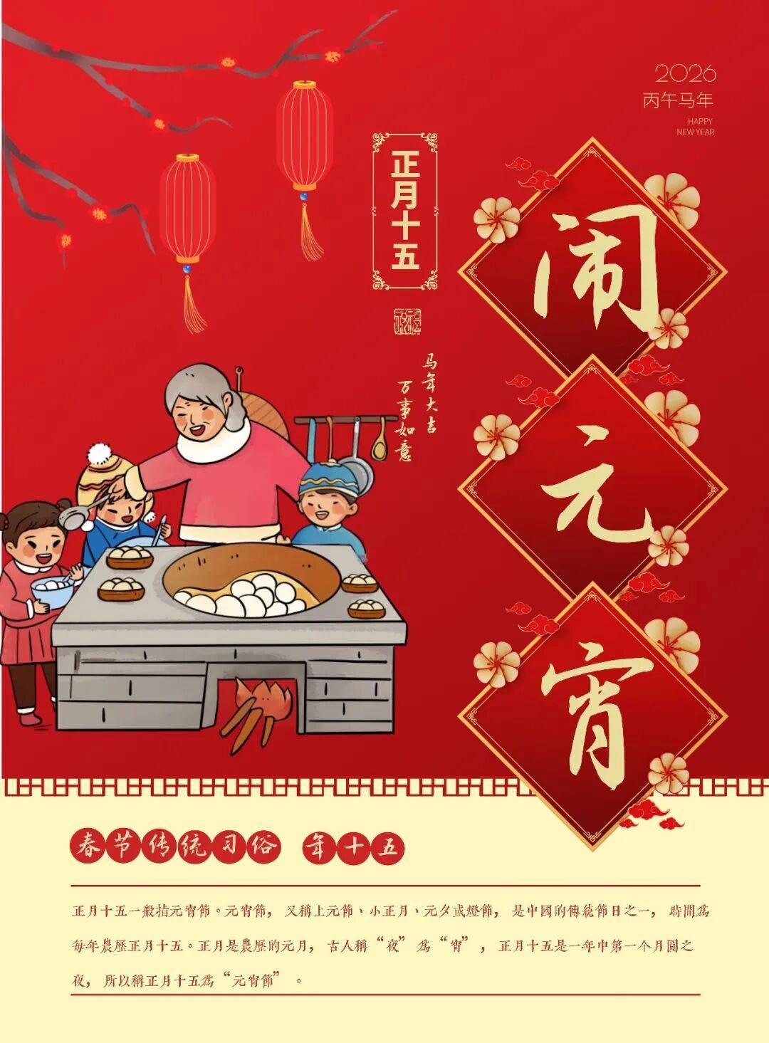 人们特别重视在这一年的开端能有个好兆头,能够交好运。而过了正月十五,春回大地,万物复苏,人们又要开始一年辛勤的耕耘和劳作,因此特别重视元宵节的各种节日的庆祝活动。比如“闹花灯”、“舞龙舞狮”、“猜灯谜”、“吃元宵”、“踩高跷”、“祭门、祭户”等等民俗活动。