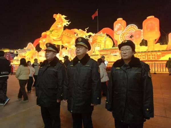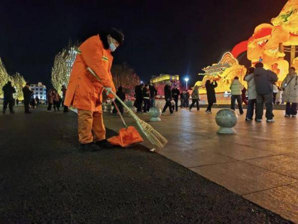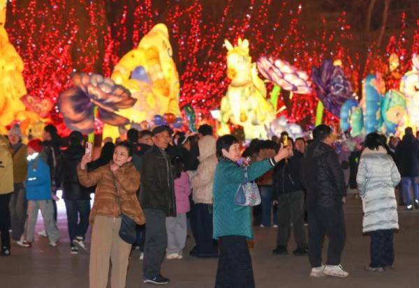 晚上7点,人流达到高峰。交警小李站在路口,已经4个小时没挪过地方。他指挥着车流,时不时有人过来问路,他一遍遍指道:“如意大街往前,灯展入口在那边。”